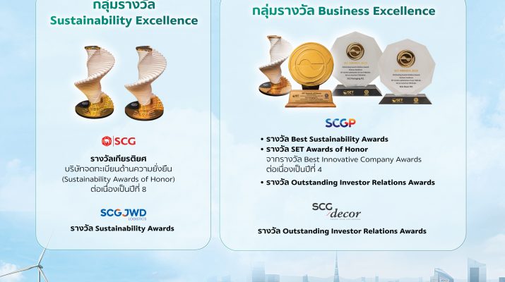 เอสซีจีได้รับรางวัลเกียรติยศ “Sustainability Excellence” ต่อเนื่องเป็นปีที่ 8 ในงาน SET AWARDS 2025ซึ่งจัดโดยตลาดหลักทรัพย์แห่งประเทศไทย ร่วมกับวารสารการเงินธนาคาร พร้อมบริษัทใน เครือ ได้แก่ SCGP, SCGD และ SCGJWDรวม 5 รางวัลใหญ่ ในกลุ่มรางวัล Sustainability Excellence และกลุ่มรางวัล Business Excellence สะท้อนความมุ่งมั่น สร้างสรรค์นวัตกรรม และความเข้มแข็งด้านการพัฒนาความยั่งยืนขององค์กร เอสซีจี โดย นายวชิระชัย คูนำวัฒนา Deputy Chief Sustainability Officer เอสซีจี รับรางวัลเกียรติยศ บริษัทจดทะเบียนด้านความยั่งยืน (Sustainability Awards of Honor) ซึ่งมอบให้บริษัทที่ได้รับรางวัลด้านความยั่งยืนยอดเยี่ยมติดต่อกันตั้งแต่ 3 ปีขึ้นไป โดยเอสซีจีเป็นเพียงรายเดียวที่ได้รับรางวัล Sustainability Excellence ต่อเนื่องเป็นปีที่ 8 ในโอกาสที่รางวัลด้านความยั่งยืนจัดครบ 10 ปี ทั้งยังเป็นองค์กรที่เข้าร่วมตั้งแต่ปีแรกและได้รับรางวัล Best Sustainability มาอย่างต่อเนื่องทุกปี ขณะที่ บริษัท เอสซีจี เจดับเบิ้ลยูดีโลจิสติกส์ จำกัด (มหาชน) หรือ SCGJWD ได้รับรางวัล Sustainability Awards กลุ่มรางวัล Sustainability Excellence ในกลุ่มบริษัท จดทะเบียนที่มีมูลค่าหลักทรัพย์ตามราคาตลาด สูงกว่า 10,000 ล้านบาท แต่ไม่เกิน 30,000 ล้านบาท ด้าน บริษัทเอสซีจี แพคเกจจิ้ง จำกัด (มหาชน) หรือ SCGP ได้รับ 3 รางวัล ได้แก่ รางวัล Best Sustainability