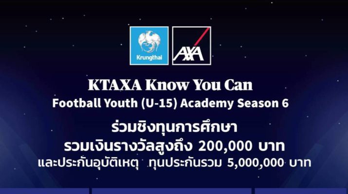 บมจ.กรุงไทย-แอกซ่า ประกันชีวิต เปิดรับสมัครเยาวชนภาคเหนือ เข้าร่วมโครงการ KTAXA Know You Can Football Youth (U-15) Academy Season 6 เพื่อชิงทุนการศึกษามูลค่าสูงถึง 200,000 บาท และประกันอุบัติเหตุ ทุนประกันรวมกว่า 5,000,000 บาท ซึ่งเปิดโอกาสให้เยาวชนอายุระหว่าง 13-15 ปี