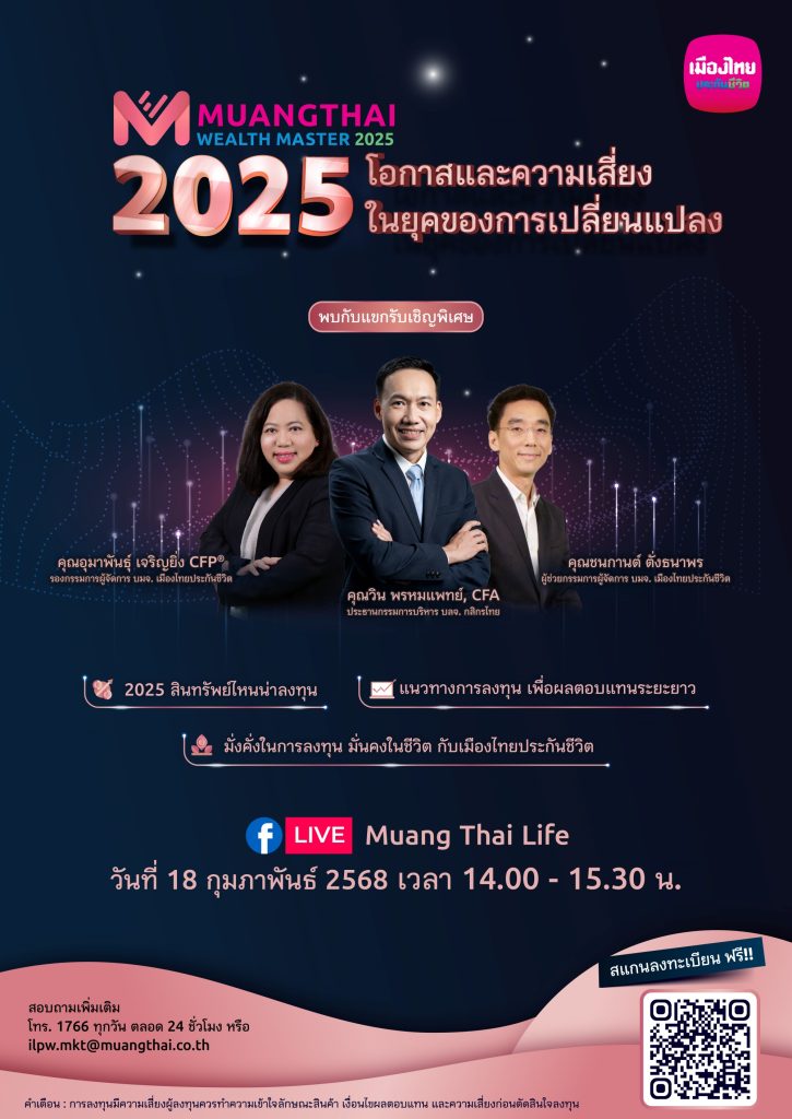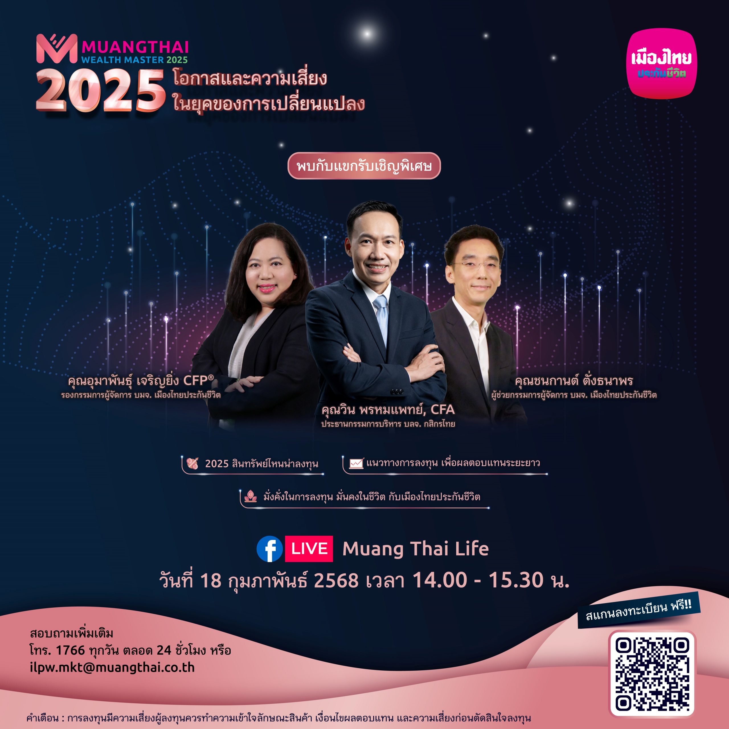 บริษัท เมืองไทยประกันชีวิต จำกัด (มหาชน) จัดงานสัมมนา Muangthai Wealth Master 2025 หัวข้อ “โอกาสและความเสี่ยง ในยุคของการเปลี่ยนแปลง” ในวันอังคาร ที่ 18 กุมภาพันธ์ 2568 เวลา 14.00 – 15.30 น. ในรูปแบบออนไลน์ Live Streaming ผ่านทาง Facebook : Muang Thai Life เพื่ออัปเดตภาวะเศรษฐกิจ มุมมองการลงทุนทั่วโลก พร้อมชี้โอกาสและความเสี่ยงการลงทุนในปี 2025 โดยได้รับเกียรติจากคุณวิน พรหมแพทย์ ประธานกรรมการบริหาร บลจ. กสิกรไทย เป็นแขกรับเชิญพิเศษ ร่วมด้วย คุณอุมาพันธุ์ เจริญยิ่ง รองกรรมการผู้จัดการ และคุณชนกานต์ ตั่งธนาพร ผู้ช่วยกรรมการผู้จัดการ บมจ.เมืองไทยประกันชีวิต