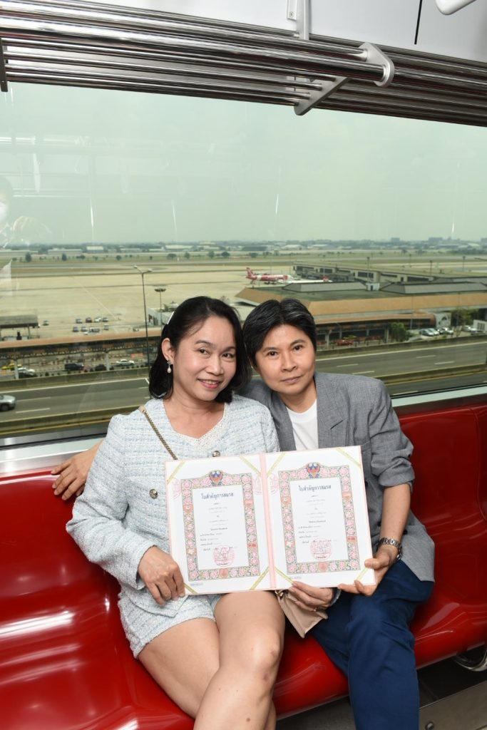 นายสุเทพ พันธุ์เพ็ง กรรมการผู้อำนวยการใหญ่ บริษัท รถไฟฟ้า ร.ฟ.ท. จำกัด (รฟฟท.) หรือผู้ให้บริการรถไฟฟ้าชานเมืองสายสีแดง เปิดเผยว่า ในวันแห่งความรักนี้ บริษัทฯ ร่วมมือกับ สำนักงานเขตจตุจักร โดยมีนางสาวภัทร์กร สินสุข ผู้อำนวยการเขตจตุจักร ร่วมกันจัดกิจกรรม “Love in the Sky 2025 ” จดทะเบียนสมรสบนขบวนรถไฟฟ้าครั้งแรกของโลก เปิดประวัติศาสตร์หน้าใหม่ ที่ขบวนรถไฟฟ้าจะเป็นพื้นที่สำหรับคู่รักทุกเพศทุกวัยได้แสดงออกถึงความรักได้อย่างเท่าเทียม เป็นการสะท้อนถึงค่านิยมในสังคมที่ยอมรับและเคารพในสิทธิของทุกคน และคู่รักยังได้แลกเปลี่ยนคำมั่นสัญญาในบรรยากาศสุดพิเศษที่ไม่เหมือนใคร โดยไฮไลต์ในงาน คือ การจดทะเบียนสมรสคู่รัก 24 คู่ ที่เป็นส่วนหนึ่งของประวัติศาสตร์แห่งความรักบนขบวนรถไฟฟ้าชานเมืองสายสีแดง ซึ่งจะพาคู่รักไปชมทัศนียภาพอันสวยงามผ่านทิวทัศน์ของชานเมืองกรุงเทพฯ และสนามบินนานาชาติดอนเมืองไปด้วยกัน
