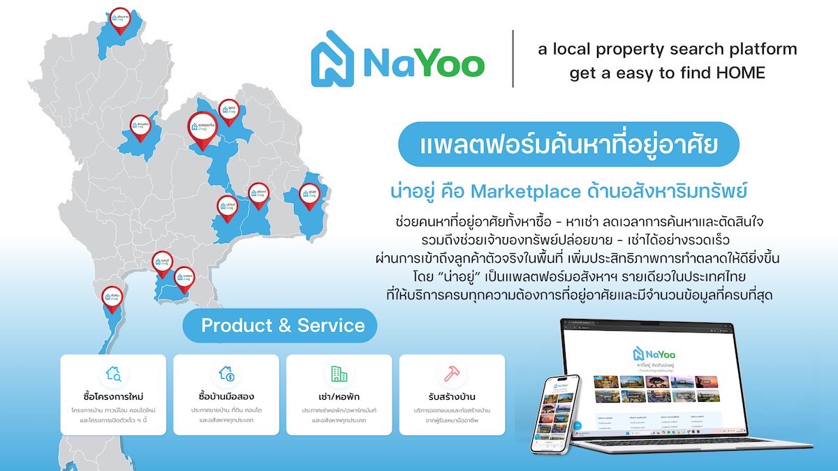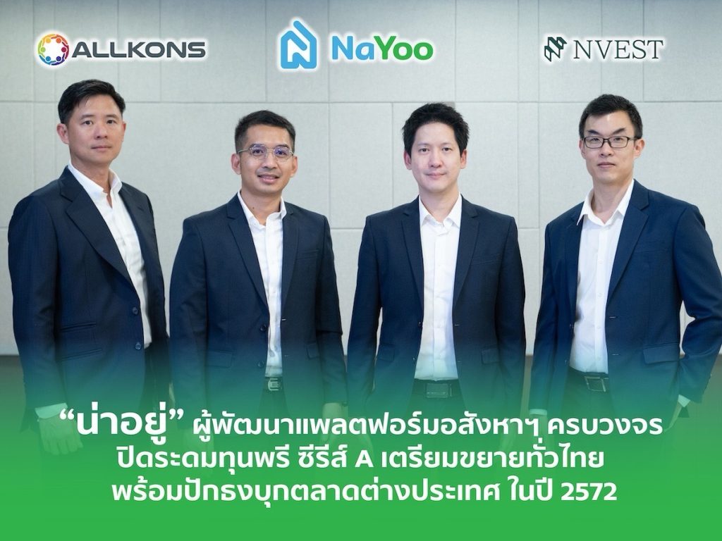 “น่าอยู่” สตาร์ทอัพแพลตฟอร์มมาร์เก็ตเพลสด้านอสังหาริมทรัพย์สัญชาติไทย (www.NaYoo.co) ผู้ให้บริการซื้อ-ขาย, เช่า, แบบบ้าน-รับสร้างบ้าน ครบจบในที่เดียว ประกาศความสำเร็จระดมทุนรอบพรี ซีรีส์ A มูลค่ามากกว่า 40 ล้านบาท ผ่านความร่วมมือกับสองพันธมิตรยักษ์ใหญ่ NVEST Venture กองทุนภายใต้ธนาคารออมสินและตลาดหลักทรัพย์แห่งประเทศไทย และบริษัท ออลคอนวัน จำกัด (Allkons One) แพลตฟอร์มซื้อ-ขายวัสดุก่อสร้าง และบริหารจัดการออนไลน์ครบวงจร เร่งเสริมแกร่งธุรกิจสู่การให้บริการโซลูชันแบบครบวงจร มุ่งพัฒนาวงการอสังหาฯ และก่อสร้างไทย ตอบโจทย์ไลฟ์สไตล์ลูกค้าตลาดออนไลน์โตต่อเนื่อง ตั้งเป้าปี 2570 ให้บริการทั่วไทย พร้อมปักธงปี 2572 ลุยตลาดต่างประเทศ