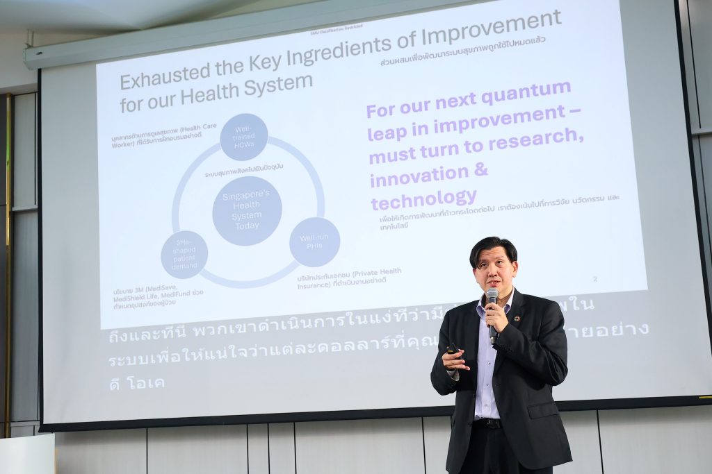 ขณะที่ดร.เว่ยหยาง ชอง รองอธิการบดีฝ่ายงานวิจัยเชิงกลยุทธ์ มหาวิทยาลัยการจัดการแห่งประเทศสิงคโปร์ (Singapore Management University) ถ่ายทอดแนวคิดและแนวปฏิบัติที่ช่วยให้ระบบสุขภาพมีความคุ้มค่าและเข้าถึงได้มากขึ้น โดยยกตัวอย่างกรณีศึกษาของประเทศสิงคโปร์เกี่ยวกับการบริหารจัดการระบบสุขภาพแบบ Value-Based Care ที่มีหน่วยงานที่เกี่ยวข้องกับระบบสาธารณสุขที่มีประสิทธิภาพสูง จึงทำให้เกิดการเข้ามามีส่วนร่วมของหลายภาคส่วน นอกจากเรื่องของการนำแนวทางมีส่วนร่วมจ่าย (Co-payment)เข้ามาใช้ การนำระบบ AI และ Robotic มาใช้ในระบบ Healthcare พร้อมทั้งการสนับสนุนจากภาครัฐ ที่มอบเงินสนับสนุนเพื่อสร้างแรงจูงใจให้โรงพยาบาลหาวิธีในการบริหารจัดการ และส่งเสริมการดูแลผู้ป่วยด้วยการป้องกันการเกิดโรค เพราะช่วยประหยัดต้นทุน บุคลากรและเวลา หากโรงพยาบาลไหน สามารถบริหารจัดการได้ดี มีเงินเหลือ ก็สามารถเก็บไว้ได้ไม่ต้องคืนรัฐบาล นอกจากนี้ รัฐบาลยังมองไปถึงการเก็บรวบรวมพฤติกรรมและพันธุกรรมของประชาชน เพื่อนำมาวิเคราะห์ เพื่อให้สามารถวินิจฉัยโรค ให้การรักษา และป้องกันการเกิดโรคในประชาชนแต่ละคนได้อย่างแม่นยำมากยิ่งขึ้นด้วย