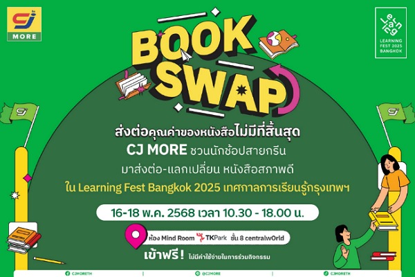 ซีเจ มอร์ (CJ MORE) ผนึกกำลังกับ Learning Fest Bangkok 2025 เทศกาลการเรียนรู้แห่งปีที่จัดโดยสถาบันอุทยานการเรียนรู้ TK Park ร่วมเปิดพื้นที่แห่งการแบ่งปันความรู้และแรงบันดาลใจให้กับคนทุกวัย โดยในปีนี้จัดขึ้นภายใต้แนวคิด “Givetopia – อุดมการ(ณ์)ให้” ส่งกิจกรรม “CJ Book Swap” เชิญชวนนักอ่านนักช้อปสายกรีน นำหนังสือสภาพดีที่ไม่ได้อ่านแล้ว มาแลกเปลี่ยนเป็นหนังสือเล่มใหม่กลับไปอ่านที่บ้านได้แบบฟรี ๆ ไม่มีค่าใช้จ่ายใด ๆ ระหว่างวันที่ 16–18 พฤษภาคม 2568 เวลา 10.30–18.00 น. ณ Mind Room, TK Park ชั้น 8 ศูนย์การค้าเซ็นทรัลเวิลด์