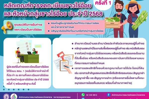 เพื่อมอบสิทธิประโยชน์ดี ๆ ให้กับเกษตรกรชาวไร่อ้อย ถึงวันที่ 31 พฤษภาคม 2568 (เว้นวันหยุดราชการ) ระหว่างเวลา 08.30 – 16.30 น. โดยสามารถยื่นคำร้องขอจดทะเบียนได้ที่เขตบริหารอ้อยและน้ำตาลทราย 1 – 8 หน่วยประจำโรงงานน้ำตาลทั้ง 58 แห่ง และสมาคมชาวไร่อ้อย 39 แห่งทั่วประเทศ ไม่เสียค่าธรรมเนียมใด ๆ ทั้งสิ้น
