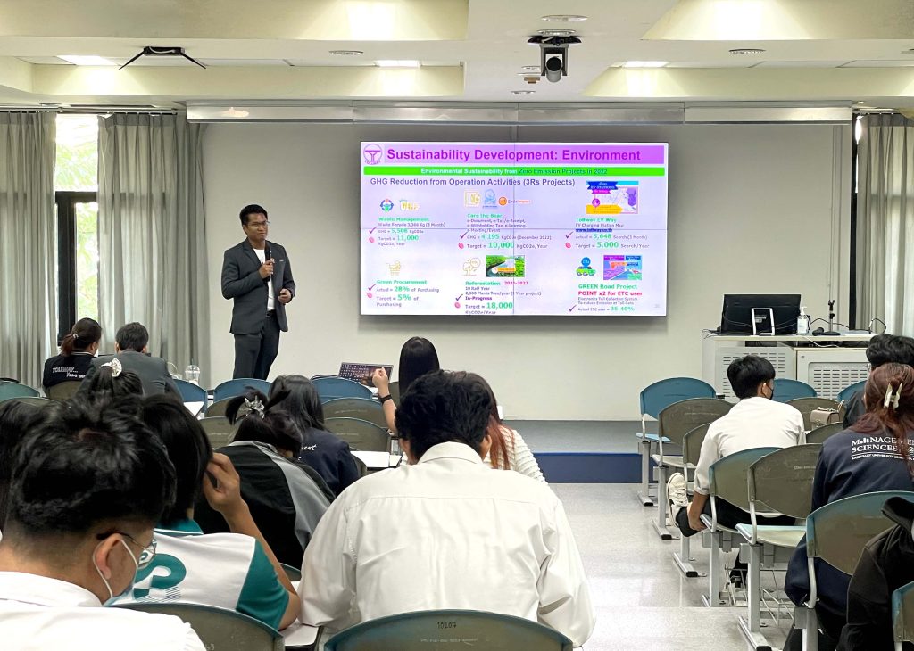 สำหรับกิจกรรมครั้งนี้เป็นส่วนหนึ่งของรายวิชา “Branding through PR and CSR” โดยมีผศ.ดร.นิภา นิรุตติกุล เป็นอาจารย์ที่ปรึกษา โดยได้เชิญคุณนพพล โพธิ์ขี ผู้อำนวยการฝ่ายพัฒนาธุรกิจและกลยุทธ์เพื่อความยั่งยืน และคุณพลาดิสัย ใจทัศน์กุล ผู้จัดการแผนกสื่อสารองค์กรและกิจกรรมเพื่อสังคม จาก DMT เข้าร่วมเป็นวิทยากรพิเศษ บรรยายในหัวข้อ “กิจกรรมเพื่อสังคมขององค์กรธุรกิจ” ซึ่งมุ่งเน้นแนวทาง ESG-in-process ที่สามารถบูรณาการเข้ากับการดำเนินธุรกิจในทุกมิติอย่างมีประสิทธิภาพ โดยเฉพาะการตอบโจทย์ปัญหาสังคมและสิ่งแวดล้อม การให้ความรู้เรื่อง CSR ขององค์กรและให้ นิสิตรวมกลุ่มนำเสนอโครงการ CSR ที่อยากทำหากกลุ่มไหนนำเสนอน่าสนใจ ทางบริษัทฯจะให้การสนับสนุนงบประมาณขับเคลื่อนเพื่อให้นิสิตได้ทำโครงการจริง
