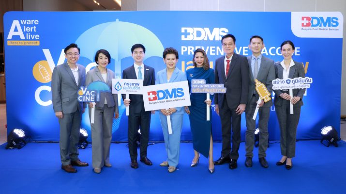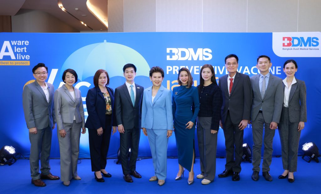 บริษัท กรุงเทพประกันชีวิต จำกัด (มหาชน) นำโดย นางสาวอรนาฎ นชะพงษ์ (ที่ 4 จากขวา) ผู้ช่วยผู้จัดการใหญ่ สายกลยุทธ์การตลาดและบริหารจัดการลูกค้า พร้อมด้วยนายแพทย์วิรุณ เกียรติคุณรัตน์ (ที่ 3 จากซ้าย) ผู้ช่วยผู้อำนวยการ ศูนย์บริการการแพทย์ ร่วมงานแถลงข่าว “BDMS Preventive Vaccine” ซึ่งเป็นความร่วมมือระหว่างโรงพยาบาลในเครือ BDMS กับบริษัทประกันชีวิตชั้นนำในการจัด “โครงการฉีดวัคซีนเพื่อป้องกันโรคในราคาพิเศษ” โดยมีวัตถุประสงค์เพื่อส่งเสริมการดูแลสุขภาพเชิงป้องกันอย่างยั่งยืนในกลุ่มผู้ถือกรมธรรม์ประกันสุขภาพ ณ ห้องประชุมเรเดียน โรงแรมเมอวินพิค บีดีเอ็มเอส เวลเนส รีสอร์ท เมื่อเร็วๆนี้