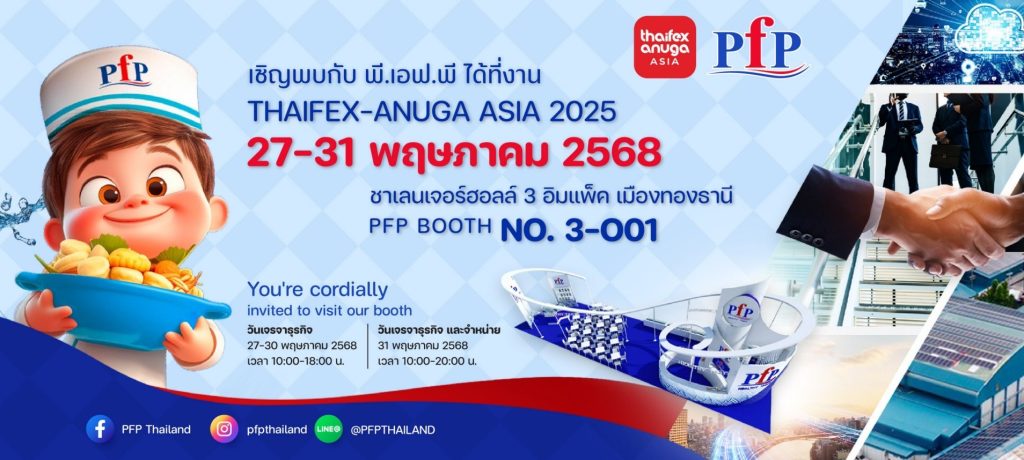 กลุ่มบริษัท พี.เอฟ.พี (PFP Group) ผู้นำด้านการผลิตและจัดจำหน่ายผลิตภัณฑ์อาหารทะเลแปรรูปครบวงจร เตรียมเปิดฉากบทใหม่ขององค์กรอย่างยิ่งใหญ่ ภายใต้แนวคิด “THE NEXT CHAPTER BEGINS – ก้าวสู่ยุคใหม่ ไร้ขีดจำกัด” พร้อมนำเสนอวิสัยทัศน์แห่งอนาคต สู่อุตสาหกรรมอาหารโลกที่ยั่งยืนและเปี่ยมด้วยนวัตกรรม ในงานแสดงสินค้าอาหารและเครื่องดื่มระดับนานาชาติ THAIFEX – Anuga Asia 2025 ซึ่งจะจัดขึ้นระหว่างวันที่ 27 – 31 พฤษภาคม 2568 ณ บูธ 3-O01 อาคารชาเลนเจอร์ 3 ศูนย์แสดงสินค้าและการประชุม อิมแพ็ค เมืองทองธานี