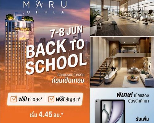 ดร.สุริยา พูลวรลักษณ์ กรรมการผู้จัดการ บริษัท เมเจอร์ ดีเวลลอปเมนท์ จำกัด (มหาชน) เปิดเผยว่า โครงการ MARU CHULA (มารุ จุฬา) ได้จัดแคมเปญ Back to school ต้อนรับเปิดเทอมในวันที่ 7-8 มิถุนายน 2568 เพื่อช่วยแบ่งเบารายจ่ายของผู้ปกครองก่อนเปิดเทอม ซื้อคอนโดในงานนี้ รับโปรโมชัน 0 บาท “ฟรี!ค่าจอง+ฟรี!สัญญา” และพิเศษยิ่งขึ้น เพียงท่านแสดงบัตรนักศึกษารับ I-pad air M3 เฉพาะงานนี้เท่านั้น ณ สำนักงานขาย (Sales Gallery) ตั้งแต่เวลา 9.30 -18.00 น.