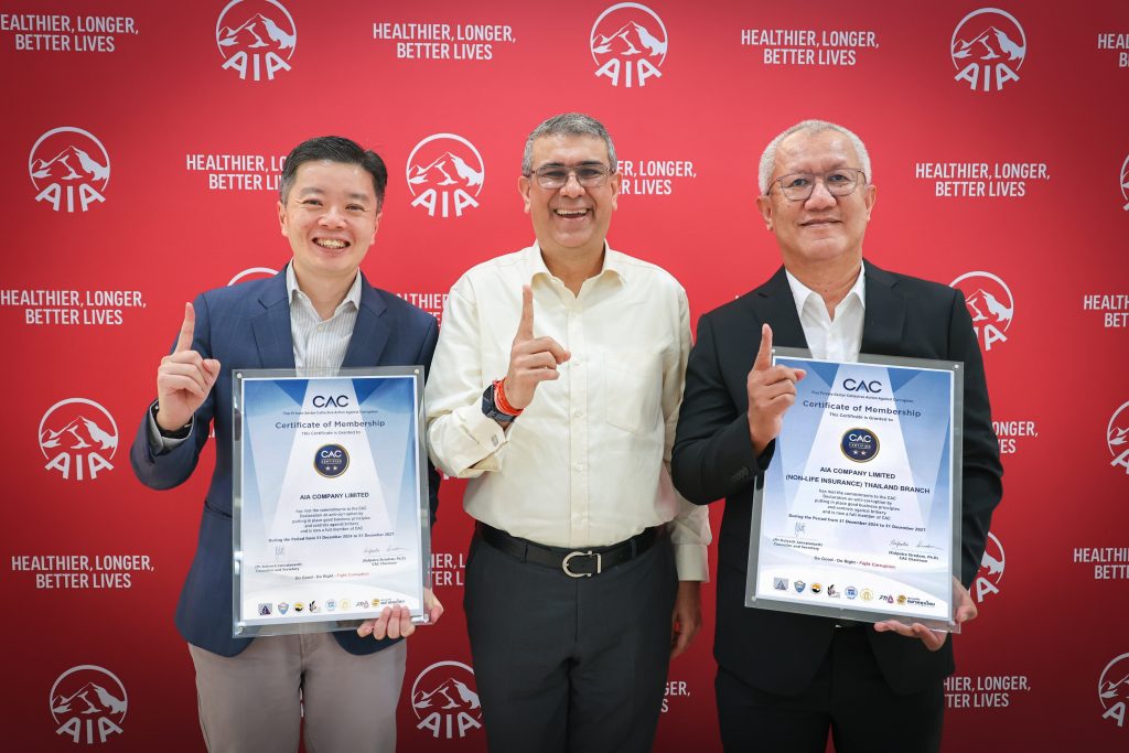 เอไอเอ ประเทศไทย ผู้นำด้านธุรกิจประกันชีวิตและสุขภาพ นำโดย นายนิคฮิล แอดวานี (กลาง) ประธานเจ้าหน้าที่บริหาร นายลู บูน เท็ค (ซ้าย) ประธานเจ้าหน้าที่ฝ่ายบริหารความเสี่ยง และนายสุภิรัช โพธิ์ถาวรผู้อำนวยการฝ่ายกำกับดูแลธุรกิจ เป็นตัวแทนเข้ารับประกาศนียบัตรรับรองต่ออายุการเป็นสมาชิกแนวร่วมต่อต้านคอร์รัปชันของภาคเอกชนไทย (Collective Action Against Corruption หรือ CAC) เป็นปีที่ 4 ซึ่งจัดขึ้นโดยสมาชิกแนวร่วมต่อต้านคอร์รัปชันของภาคเอกชนไทย ถือเป็นการตอกย้ำถึงจุดยืนในการดำเนินธุรกิจด้วยหลักธรรมาภิบาล และการบริหารงานอย่างโปร่งใส ภายใต้ปรัชญาการดำเนินธุรกิจตามนโยบาย ESG เพื่อมุ่งสู่การเป็นผู้นำด้าน ESG ในระดับภูมิภาค