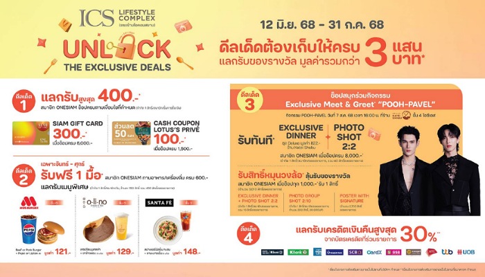 ช็อปสนุก ได้ครบทุกความสุข ทั้งการเก็บคูปองเงินสด แลก SIAM GIFT CARD อร่อยฟรีกับร้านอาหารชื่อดัง และพิเศษสุดกับการลุ้นร่วมกิจกรรม “EXCLUSIVE DINNER WITH POOH-PAVEL” คู่จิ้นสุดฮอตจาก “Pit Babe The Series” สายช็อป สายกิน และสายฟิน อย่าพลาด ช็อปเก็บดีลเด็ดตั้งแต่วันที่ 12 มิถุนายน 2568- 31 กรกฎาคม 2568 ที่ ICS Lifestyle Complex
