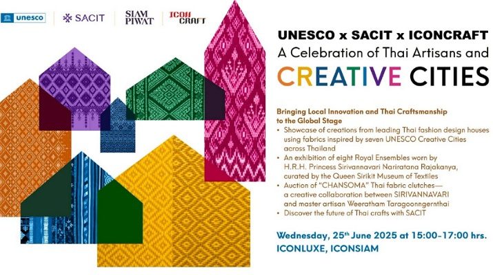 ยูเนสโก (UNESCO) และสถาบันส่งเสริมศิลปหัตถกรรมไทย (องค์การมหาชน) หรือ SACIT ร่วมกับ ไอคอนคราฟต์ (ICONCRAFT) พื้นที่แห่งแรงบันดาลใจ แหล่งรวมงานคราฟต์สร้างสรรค์จากช่างฝีมือไทย จัดแคมเปญพิเศษ “UNESCO x SACIT x ICONCRAFT : A Celebration of Thai Artisans and Creative Cities” เชิดชูช่างฝีมือไทยและร่วมสนับสนุนโครงการ Creative Cities Network เครือข่ายเมืองสร้างสรรค์ของยูเนสโก ยกระดับงานภูมิปัญญาท้องถิ่นจาก 7 จังหวัดเมืองสร้างสรรค์ ต้นแบบมรดกแห่งวัฒนธรรม และช่างฝีมือไทย สู่ผลงานหัตถศิลป์ร่วมสมัยจากการสร้างสรรค์ของ 14 สุดยอดดีไซเนอร์ไทยและแบรนด์ SIRIVANNAVARI เพื่อต่อยอดเป็นงานดีไซน์ใหม่ที่ยั่งยืน ส่งต่อแรงบันดาลใจให้กับคนรุ่นใหม่