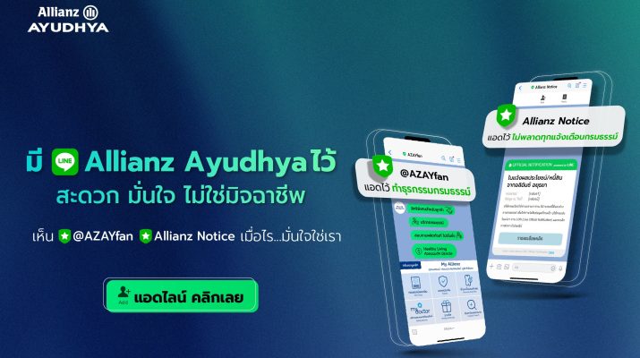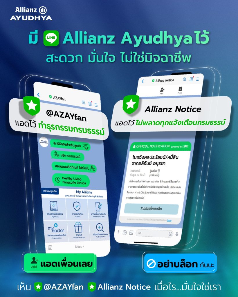 การเปิดใช้งานช่องทางการสื่อสารผ่าน LINE ทั้ง @AZAYfan และ Allianz Notice สะท้อนถึงความมุ่งมั่นของอลิอันซ์ อยุธยาในการพัฒนาบริการดิจิทัลอย่างต่อเนื่อง เพื่อสร้างประสบการณ์ที่ดีที่สุดให้กับลูกค้าในทุกขั้นตอนของการดูแลด้านประกันชีวิตและสุขภาพ
