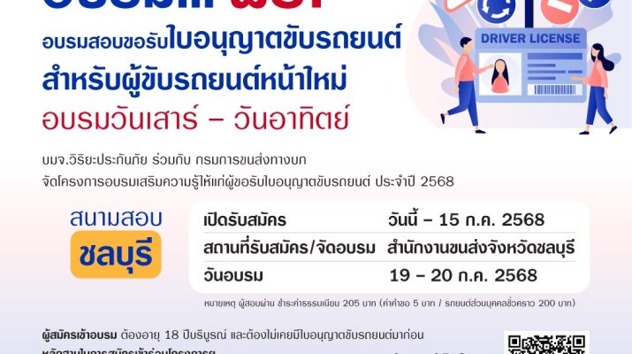 เปิดรับสมัครแล้ว ! โครงการ “อบรมเสริมความรู้ผู้ขอรับใบอนุญาตขับรถยนต์” รอบภูมิภาค รุ่นที่ 162 โดย บมจ.วิริยะประกันภัย ร่วมกับ กรมการขนส่งทางบก เปิดโอกาสให้นักขับขี่มือใหม่ และประชาชนทั่วไปที่ยังไม่เคยมีใบอนุญาตขับรถยนต์ เข้าร่วมการอบรมความรู้การขับขี่อย่างปลอดภัย พร้อมสอบขอรับใบอนุญาตขับรถยนต์ได้ทันที ในวันที่ 19 – 20 ก.ค. 2568 ณ สำนักงานขนส่งจังหวัดชลบุรี ผู้สนใจสมัครเข้าร่วมโครงการฯ ได้ตั้งแต่วันนี้ – 15 ก.ค. 2568