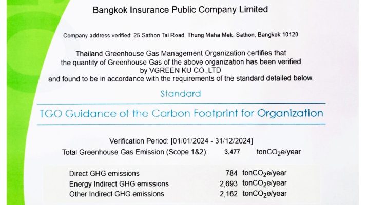บริษัท กรุงเทพประกันภัย จำกัด (มหาชน) ได้รับประกาศนียบัตรเครื่องหมาย “คาร์บอนฟุตพริ้นท์ขององค์กร” (Carbon Footprint for Organization หรือ CFO) ในพิธีมอบประกาศนียบัตรเครื่องหมายรับรองฉลากคาร์บอน จัดโดยองค์การบริหารจัดการก๊าซเรือนกระจก (องค์การมหาชน) ณ ห้อง Conference Hall สถาบันเพื่อการยุติธรรมแห่งประเทศไทย (องค์การมหาชน) ถนนแจ้งวัฒนะ กรุงเทพฯ เมื่อวันที่ 25 มิถุนายน 2568
