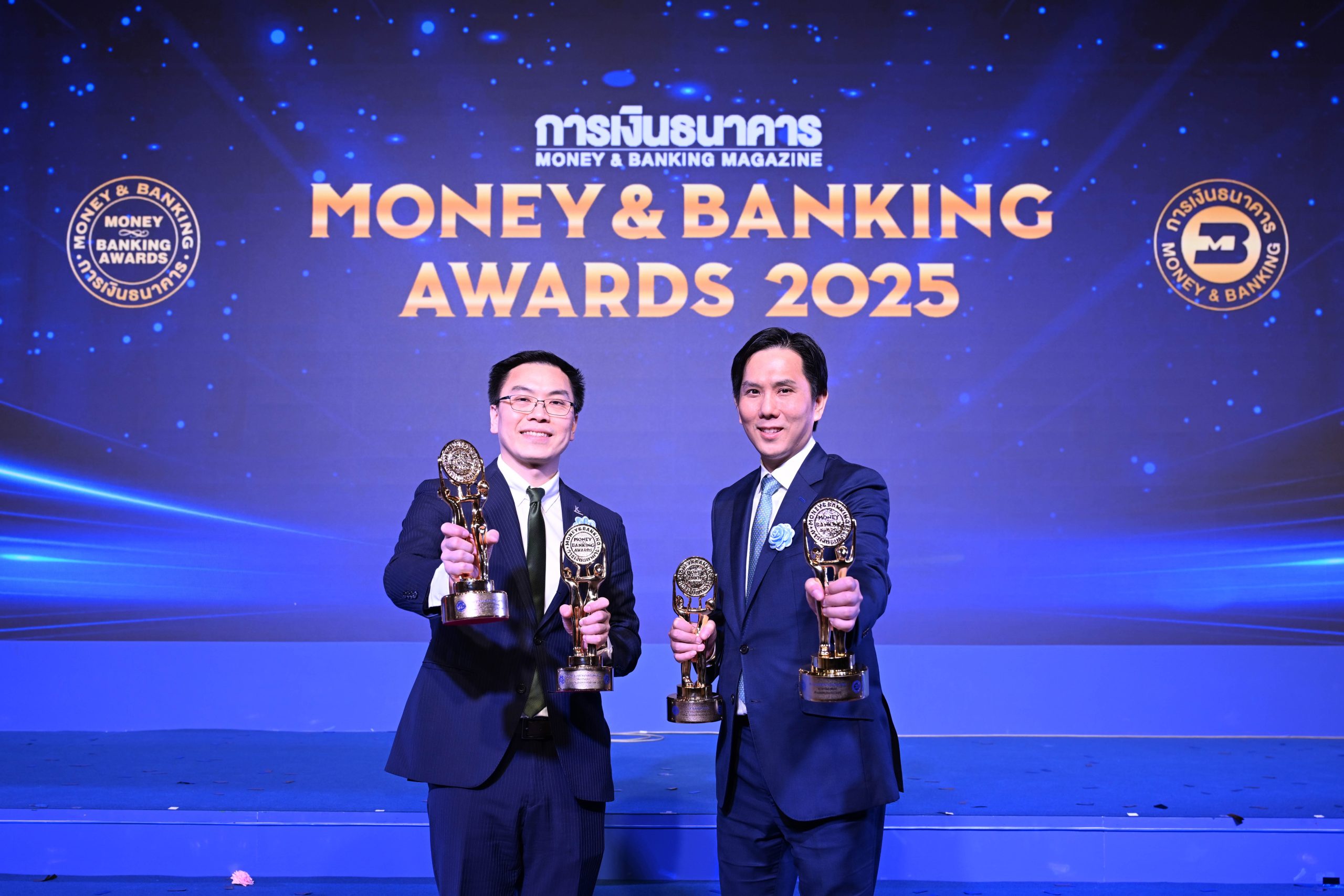 ดร.กรินทร์ บุญเลิศวณิชย์ (ซ้าย) รองผู้จัดการใหญ่ ธนาคารกสิกรไทย เป็นผู้แทนธนาคารรับ 3 รางวัลยอดเยี่ยม ได้แก่ รางวัลธนาคารที่มีความโดดเด่นด้านนวัตกรรมทางการเงิน รางวัลธนาคารที่มีบริการยอดเยี่ยมด้านบัตรเครดิต และรางวัล K PLUS แอปพลิเคชันทางการเงินขวัญใจผู้เข้าชมงาน ประจำปี 2568 ซึ่งรางวัลดังกล่าวมาจากผลการสำรวจความคิดเห็นผู้สมัครและขอใช้บริการในงานมหกรรมการเงินประจำปี 2568 ทั่วประเทศ พร้อมด้วยนายฐานันดร โชลิตกุล, CFA (ขวา) Chief Investment Officer บลจ.กสิกรไทย เป็นผู้แทนรับมอบรางวัลกองทุนยอดเยี่ยมแห่งปี 2568 ประเภทกองทุนตราสารหนี้ไทยและต่างประเทศบางส่วน (Fixed Income Fund) ในงาน Money & Banking Awards 2025 จัดโดยวารสารการเงินธนาคาร ณ โรงแรมไฮแอท รีเจนซี กรุงเทพฯ เมื่อเร็วๆ นี้