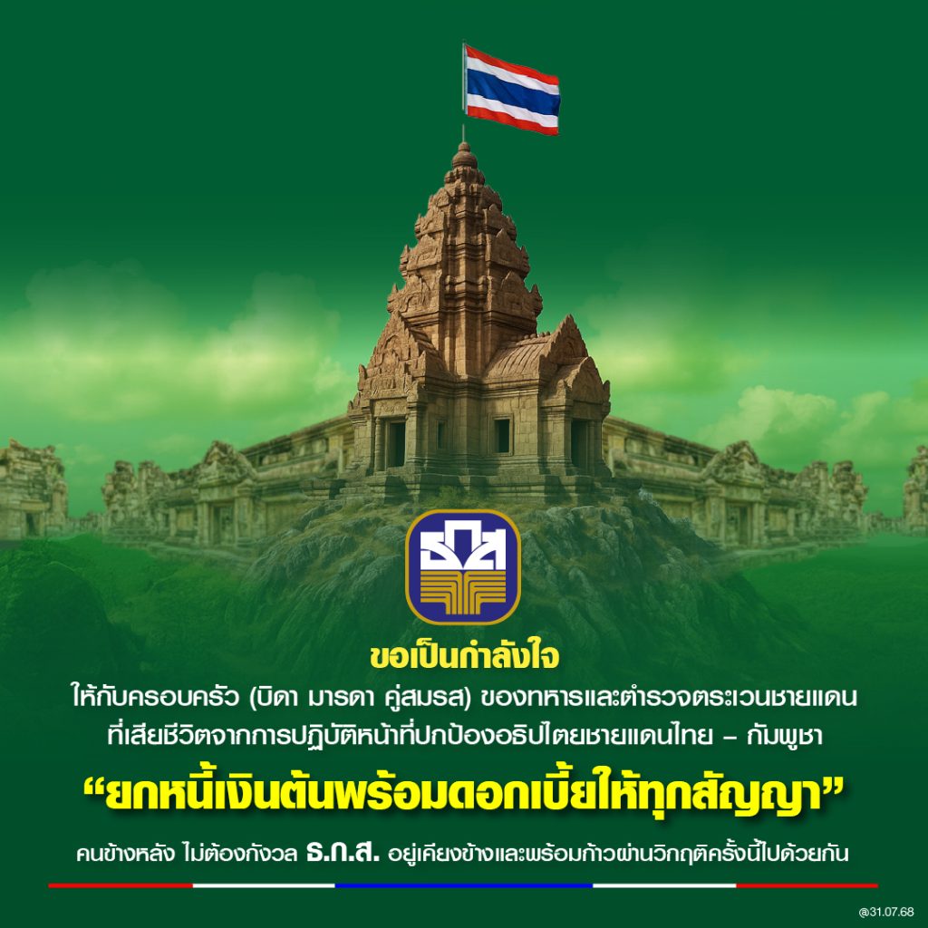 นายฉัตรชัย ศิริไล ผู้จัดการ ธนาคารเพื่อการเกษตรและสหกรณ์การเกษตร (ธ.ก.ส.) เปิดเผยว่า จากสถานการณ์ความไม่สงบในพื้นที่ชายแดนไทย – กัมพูชา อันส่งผลกระทบอย่างรุนแรงต่อชีวิตความเป็นอยู่ ความปลอดภัยในชีวิตและทรัพย์สิน ของเกษตรกรลูกค้าของธนาคาร โดยมีทั้งทหารและประชาชนได้รับบาดเจ็บหรือเสียชีวิต ตลอดจนที่อยู่อาศัยรวมถึงพื้นที่ทำกินได้รับความเสียหาย และเพื่อให้ความช่วยเหลือและสงเคราะห์ลูกหนี้ และลดภาระให้สามารถดำรงชีพต่อไปได้อย่างมั่นคงโดย นายจุลพันธ์ อมรวิวัฒน์ รัฐมนตรีช่วยว่าการกระทรวงการคลัง ในฐานะประธานกรรมการ ธ.ก.ส. เป็นประธาน ได้มีมติเห็นชอบการให้ความช่วยเหลือลูกหนี้ กรณีบุตร คู่สมรส ของลูกค้า ธ.ก.ส. ที่เป็นทหาร หรือ ตำรวจตระเวนชายแดน (ตชด.) ที่เสียชีวิตจากการปฏิบัติหน้าที่ในเหตุการณ์ความไม่สงบระหว่างประเทศไทย – กัมพูชา โดยธนาคารจะยกหนี้ในส่วนของต้นเงินกู้ทุกสัญญา และยกหนี้ในส่วนของดอกเบี้ยค้างรับและดอกเบี้ยปรับทั้งจำนวน ภายใต้สัญญาที่ใช้แหล่งเงินทุน ธ.ก.ส. เป็นกรณีพิเศษ