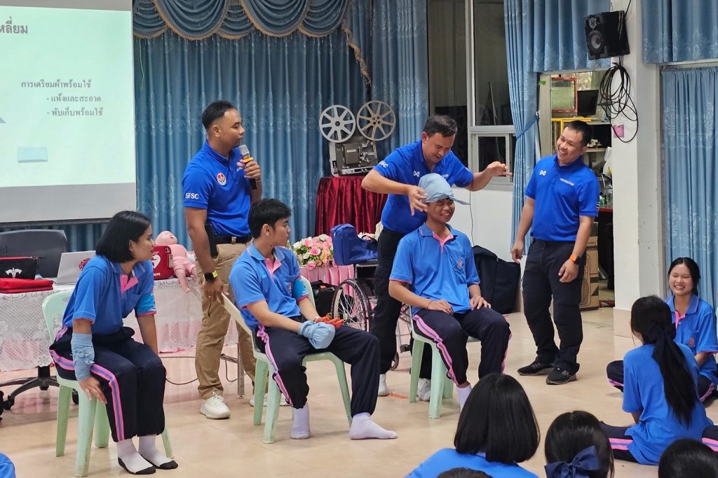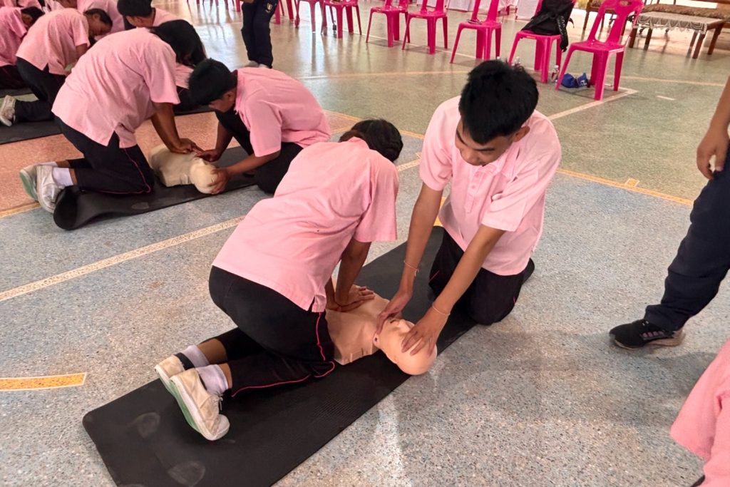 ทั้งนี้ภายในกิจกรรม พนักงานจิตอาสาบรรเทาภัยและวิทยากรได้แนะนำและสาธิตวิธีการปฐมพยาบาลเบื้องต้น พร้อมฝึกฝนให้น้องๆ เยาวชนได้ร่วมลงมือปฏิบัติอย่างถูกวิธี เช่น การรักษาบาดแผลทั่วไปและบาดแผลจากสัตว์มีพิษและไม่มีพิษ การห้ามเลือด การใส่เฝือก การช่วยเหลือเด็กและผู้ใหญ่จากการสำลักอาหาร รวมถึงการช่วยชีวิตพื้นฐานโดยการทำ CPR และการใช้เครื่อง AED ปั๊มหัวใจ นอกจากนี้ บริษัทฯ ยังได้มอบอุปกรณ์การปฐมพยาบาล รถเข็นผู้ป่วย ชุดเฝือกสำเร็จรูป และกระเป๋ายาพร้อมเวชภัณฑ์ให้แก่โรงเรียนต่างๆ สามารถใช้ประโยชน์ภายในโรงเรียนและยังสามารถช่วยเหลือผู้อื่นได้อีกด้วย