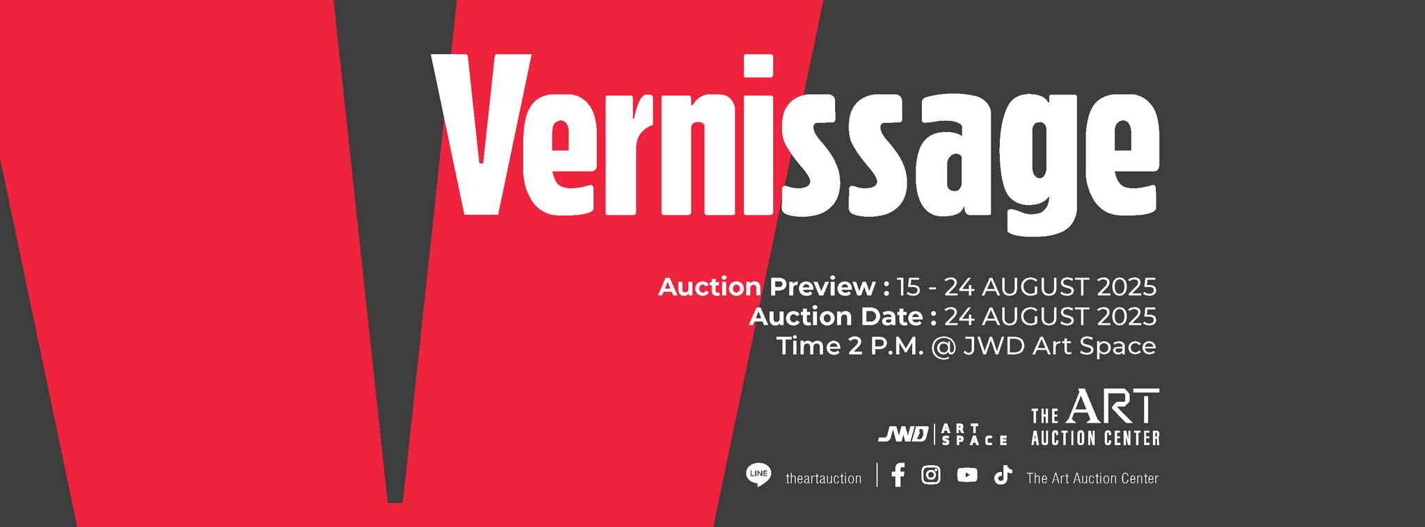 เชิญร่วมสัมผัสประสบการณ์ระดับโลกใน “Vernissage” ด้วยตัวคุณเอง ตามกำหนดการดังนี้ นิทรรศการแสดงผลงาน วันที่ 15-24 สิงหาคม 2568 เวลา 10.00 – 19.00 น. ณ JWD Art Space การประมูลผลงานศิลปะ วันอาทิตย์ที่ 24 สิงหาคม 2568 เริ่มเวลา 14.00 น. เป็นต้นไป ณ JWD Art Space