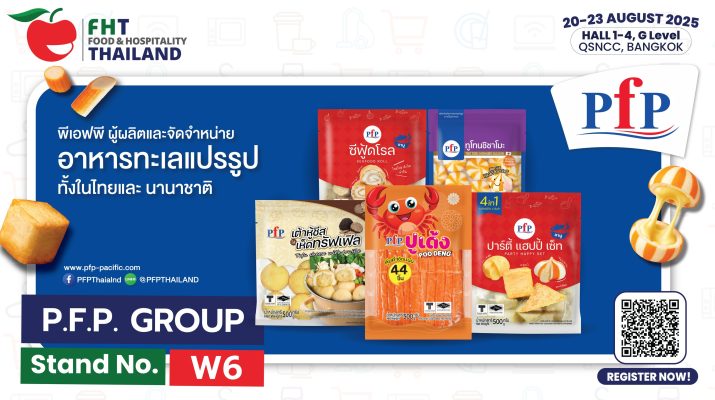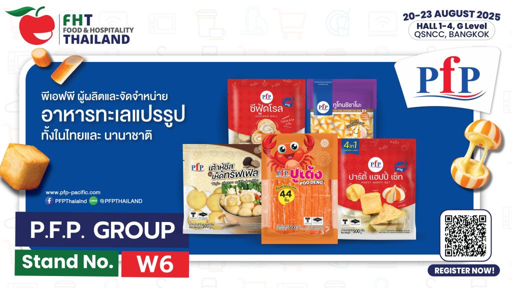 กลุ่มบริษัท พี.เอฟ.พี (PFP Group) ผู้นำด้านการผลิตและจัดจำหน่ายผลิตภัณฑ์อาหารทะเลแปรรูปครบวงจร เตรียมโชว์ศักยภาพความเป็นผู้นำด้านโซลูชันอาหารคุณภาพ ตอบโจทย์ในทุกธุรกิจอาหาร ครอบคลุมตั้งแต่โรงแรม ร้านอาหาร คาเฟ่ จนถึงธุรกิจจัดเลี้ยง (HoReCa) ในงาน FOOD & Hospitality Thailand 2025 (FHT 2025) งานแสดงสินค้าและเจรจาธุรกิจด้านอาหารและการบริการระดับชั้นนำของเอเชีย จัดขึ้นระหว่างวันที่ 20 – 23 สิงหาคม 2568 ที่บูธ W6 ฮอลล์ 4 ณ ศูนย์ประชุมแห่งชาติสิริกิติ์