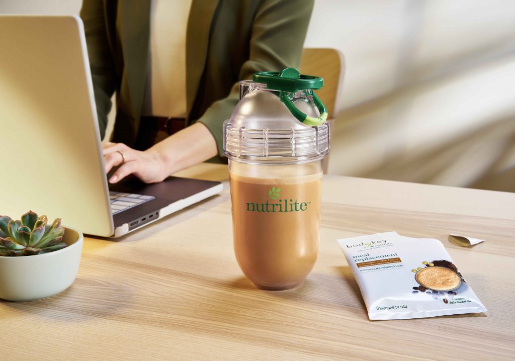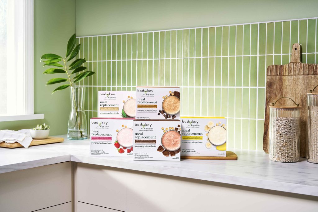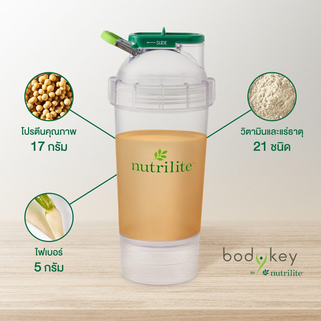 พร้อมกันนี้ แอมเวย์ประเทศไทย ขอแนะนำตัวเลือกใหม่ กับ ผลิตภัณฑ์ทดแทนมื้ออาหาร “บอดี้คีย์ บาย นิวทริไลท์” (BodyKey by Nutrilite) อาหารควบคุมหรือลดน้ำหนัก สูตรน้ำตาลน้อยกว่า มีน้ำตาล 6 กรัมต่อซอง ตอบโจทย์เฉพาะบุคคล มีหลากหลายรสชาติให้เลือกตามความชอบ อาทิ กลิ่นกาแฟ เบอร์รี บานาน่า มิลค์ที และรสโกโก้ ผลิตภัณฑ์บอดี้คีย์มีส่วนประกอบสำคัญ คือ โปรตีนจากพืช (ถั่วเหลืองและเมล็ดเจีย) ใยอาหาร คาร์โบไฮเดรต ไขมัน วิตามินและแร่ธาตุที่สำคัญต่าง ๆ เพื่อให้พลังงานและสารอาหารอย่างเหมาะสมสำหรับหนึ่งมื้อ ใยอาหารช่วยเพิ่มกากในระบบทางเดินอาหารและช่วยกระตุ้นการขับถ่าย เหมาะสำหรับผู้ที่ต้องการควบคุมหรือลดน้ำหนัก โดย 1 กล่อง บรรจุ 14 ซอง ซองละ 51 กรัม ไม่เจือสีสังเคราะห์และไม่ใช้วัตถุกันเสีย รับประทานวันละ 1 หรือ 2 ครั้ง ทดแทนมื้ออาหารปกติ โดยเทส่วนผสม 1 ซอง ลงในน้ำ 250 มิลลิลิตร คนให้เข้ากันและรับประทานทันที ราคาสมาชิก 1,700 บาท ราคาขายปลีก 1,870 บาท