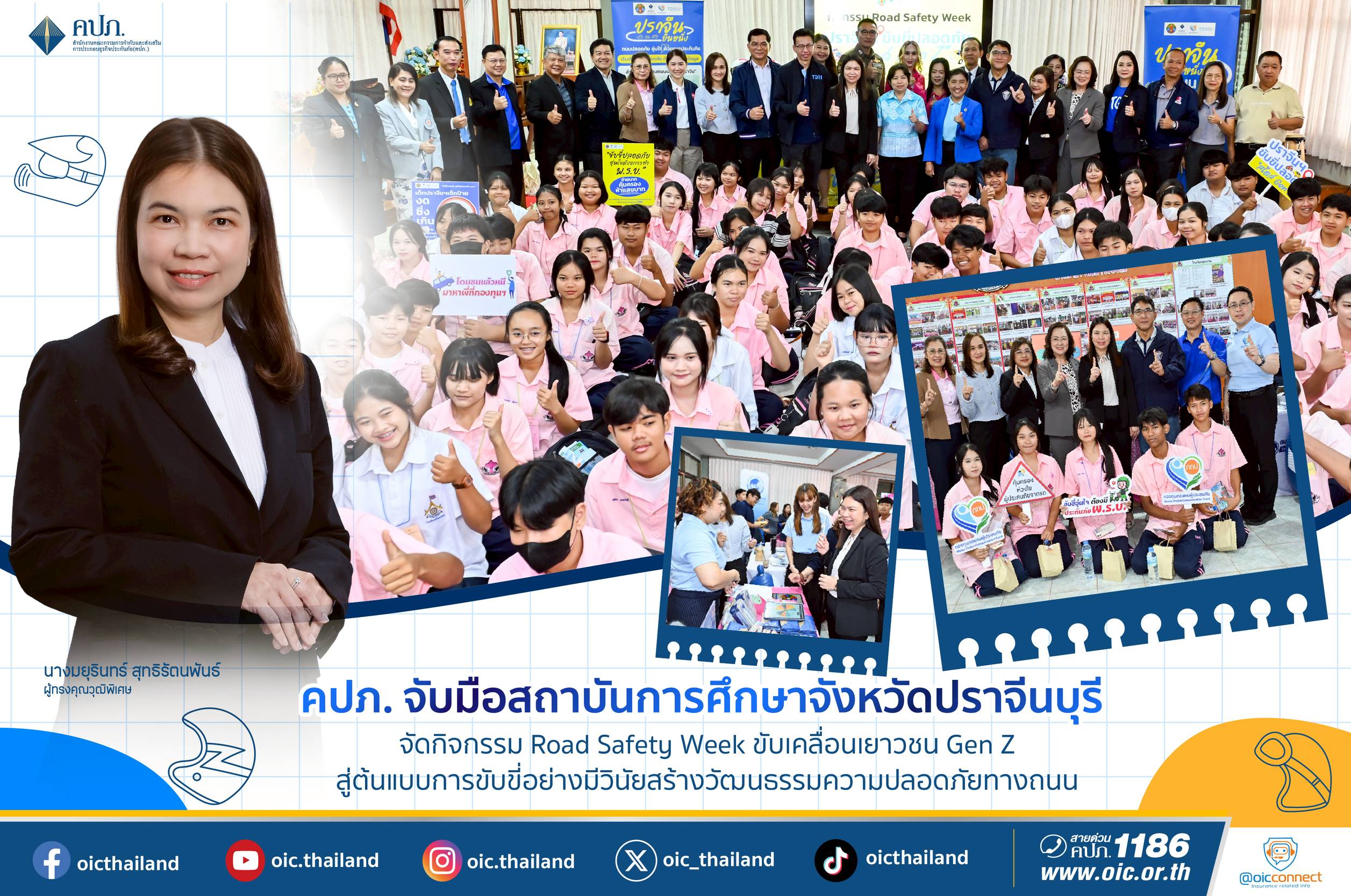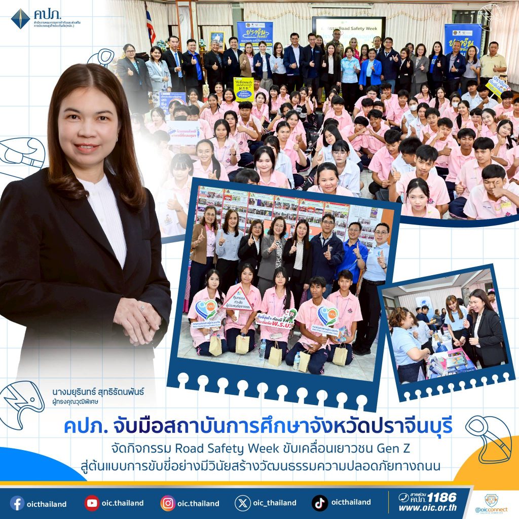 เมื่อวันที่ 22 สิงหาคม 2568 สำนักงานคณะกรรมการกำกับและส่งเสริมการประกอบธุรกิจประกันภัย (สำนักงาน คปภ.) ร่วมกับกองทุนทดแทนผู้ประสบภัย จัดกิจกรรม Road Safety Week “ปราจีนขับขี่ปลอดภัย สไตล์ Gen Z” ภายใต้ โครงการเยาวชนปลอดภัยกับการประกันภัยภาคบังคับ (Smart Education Smart Youth) ณ โรงเรียนศรีมหาโพธิ จังหวัดปราจีนบุรี โดยมีนายอาภากร ปานเลิศ รองเลขาธิการ ด้านกำกับธุรกิจประกันภัย สำนักงาน คปภ. พร้อมด้วยคณะผู้บริหาร สำนักงาน คปภ. ผู้แทนจากสมาคมประกันชีวิตไทย สมาคมประกันวินาศภัยไทย และบริษัทประกันภัย เข้าร่วมในพิธีอย่างคับคั่ง โดยมี นางสาวจุฑามาศ บัวเผื่อน นายอำเภอศรีมหาโพธิ และนางนรีรัตน์ ย่างเล้ง ผู้อำนวยการโรงเรียนศรีมหาโพธิ ให้การต้อนรับ