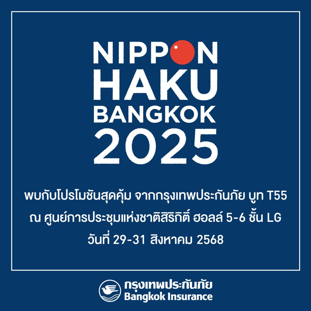 บริษัท กรุงเทพประกันภัย จำกัด (มหาชน) ร่วมออกบูทในงาน Nippon Haku Bangkok 2025 งานมหกรรมญี่ปุ่นที่ใหญ่ที่สุดในไทย ภายใต้แนวคิด ยิ่งรู้จัก ยิ่งรักญี่ปุ่นระหว่างวันที่ 29-31 สิงหาคม 2568 ณ ศูนย์การประชุมแห่งชาติสิริกิติ์ ฮอลล์ 5-6 ชั้น LG ในงานนี้ บริษัทฯ ได้จัดเต็มโปรโมชันสุดพิเศษสำหรับผู้ที่มองหาความอุ่นใจในการเดินทางไม่ว่าจะเพื่อการท่องเที่ยวหรือเพื่อการศึกษาในต่างประเทศ รวมถึงประกันภัยประเภทอื่นๆ เช่น ประกันภัยรถยนต์ ประกันอัคคีภัย ประกันภัยอุบัติเหตุส่วนบุคคล ประกันภัยสุขภาพ ประกันภัยโรคมะเร็ง ฯลฯ ที่ให้ความคุ้มครองรองรับไลฟ์สไตล์ของลูกค้า