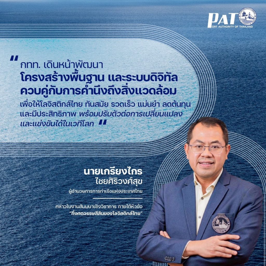 นายเกรียงไกร ไชยศิริวงศ์สุข ผู้อำนวยการ กทท. กล่าวเปิดงานถึงความสำคัญของโลจิสติกส์ว่า “การขนส่งทางน้ำถือเป็นหัวใจสำคัญของระบบโลจิสติกส์และการคมนาคมของประเทศไทย โดยเฉพาะในการรองรับการค้าข้ามประเทศผ่านท่าเรือหลัก เช่น ท่าเรือกรุงเทพและท่าเรือแหลมฉบัง การสัมมนาในครั้งนี้จัดขึ้นโดย MLI หน่วยงานนำร่องของ กทท. ที่รวบรวมและพัฒนาองค์ความรู้ด้านโลจิสติกส์ระหว่าง กทท. และผู้มีส่วนได้ส่วนเสียทุกภาคส่วน มีเป้าหมายในการสร้างประเทศไทยให้เป็นผู้นำอุตสาหกรรมการขนส่งทางน้ำครบวงจร ในวันนี้จึงนับเป็นเวทีสำคัญที่เปิดโอกาสให้ทุกภาคส่วนได้ร่วมแลกเปลี่ยนแนวคิดและประสบการณ์ ซึ่งถือเป็นส่วนหนึ่งในการพัฒนาและขับเคลื่อนระบบโลจิสติกส์ไทยให้ทันสมัย รวดเร็ว แม่นยำ ลดต้นทุน และมีประสิทธิภาพ พร้อมปรับตัวต่อการเปลี่ยนแปลงและแข่งขันในเวทีโลก โดย กทท. ในฐานะผู้นำด้านการขนส่งทางน้ำของประเทศ พร้อมพัฒนาโครงสร้างพื้นฐานและระบบดิจิทัล เพื่อรองรับการขนส่งแบบหลากหลายรูปแบบ ตอบโจทย์ผู้ใช้บริการในยุคดิจิทัล ตลอดจนการส่งเสริมท่าเรือสีเขียว เพื่อเตรียมก้าวสู่การเป็นศูนย์กลางโลจิสติกส์ระดับภูมิภาคในอนาคต”
