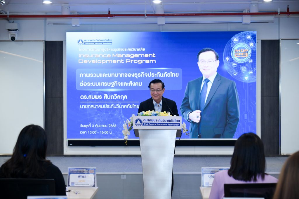 เมื่อวันที่ 3 กันยายน 2568 ณ ห้องสัมมนา 501 สมาคมประกันวินาศภัยไทย ดร.สมพร สืบถวิลกุล นายกสมาคมประกันวินาศภัยไทย เป็นประธานในพิธีเปิดการอบรมโครงการพัฒนาผู้บริหารธุรกิจประกันวินาศภัย (Insurance Management Development Program : IMDP) รุ่นที่ 29 พร้อมบรรยายพิเศษหัวข้อ “ภาพรวมและบทบาทของธุรกิจประกันภัยไทยต่อระบบเศรษฐกิจและสังคม” และได้รับเกียรติจาก นายชูฉัตร ประมูลผล เลขาธิการ คปภ. ร่วมบรรยายพิเศษหัวข้อ “ทิศทางการกำกับและส่งเสริมธุรกิจประกันวินาศภัยไทย” ซึ่งโครงการดังกล่าวจัดโดยคณะกรรมการพัฒนาธุรกิจและวิชาการประกันภัย เพื่อพัฒนาความรู้ ทักษะ และขีดความสามารถของผู้บริหารในธุรกิจประกันวินาศภัยให้ก้าวสู่การเป็นผู้บริหารความเสี่ยงมืออาชีพ โดยมีผู้เข้ารับการอบรมรวม 56 คน จากบริษัทประกันภัย บริษัทนายหน้าประกันภัย และสำนักงาน คปภ. ระยะเวลาการอบรมตั้งแต่วันที่ 3 กันยายน 2568 ถึง 30 พฤศจิกายน 2568