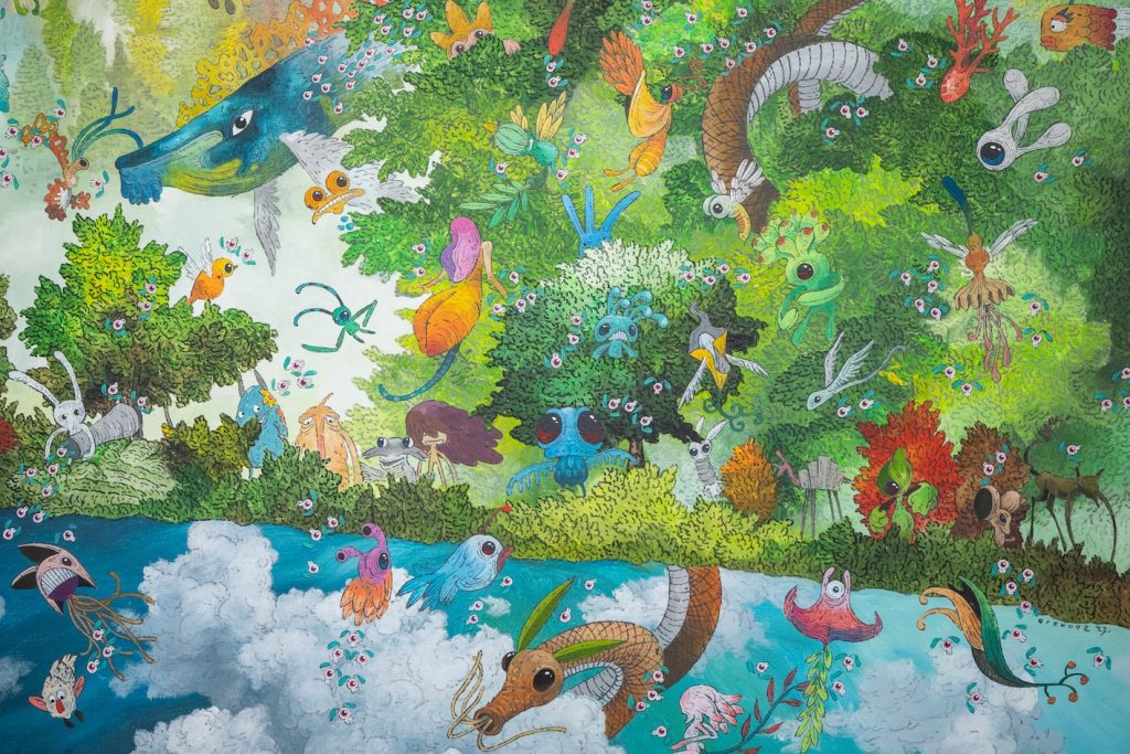 Lee Jaeyual – ผู้รังสรรค์งานที่ดูจากระยะไกลจะเหมือนจิตรกรรมเกาหลีแบบดั้งเดิม แต่เมื่อเข้าใกล้จะเห็นความทันสมัยอันโดดเด่น การผสมผสานสีอะคริลิกบนกระดาษสดใส เมฆและหมอกในพื้นหลังสร้างบรรยากาศลึกลับ ทำให้ผู้ชมรู้สึกเหมือนหลุดเข้าไปในอีกโลกหนึ่งที่เหนือจริง เทคนิค mixed media ผสานอิทธิพลตะวันออกและตะวันตกอย่างมีเอกลักษณ์ สวยงาม เงียบสงบ ชวนให้ครุ่นคิด แรงบันดาลใจมาจากความสัมพันธ์ระหว่างมนุษย์กับธรรมชาติ