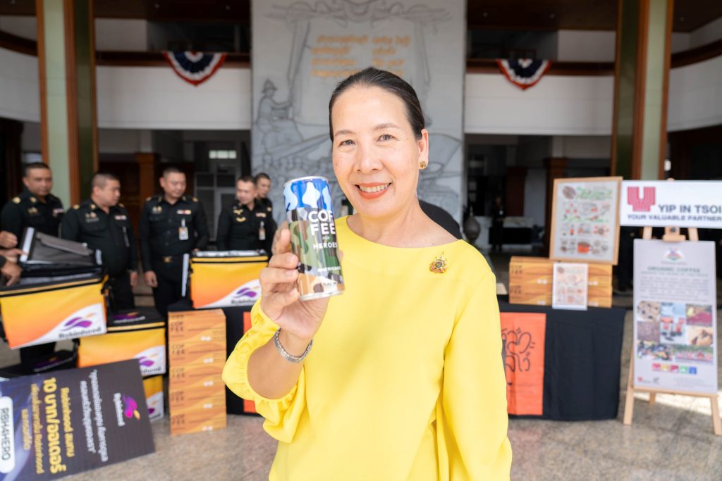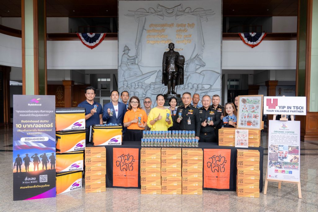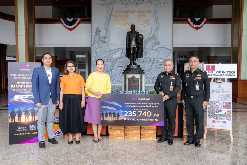 คุณมรกต ยิบอินซอย กรรมการผู้จัดการใหญ่และประธานเจ้าหน้าที่บริหาร (ที่ 3 จากซ้าย) คุณแววรัตน์ ชำนาญภักดี ผู้อำนวยการสายงานทรัพยากรบุคคลและสื่อสารองค์กร (ที่ 2 จากซ้าย) บริษัท ยิบอินซอย จำกัด พร้อมทั้งผู้บริหาร คุณพงศ์ปณต อิงคสิทธิ์ ประธานเจ้าหน้าที่บริหารฝ่ายธุรกิจ Chief Commercial Officer (CCO) (ซ้ายสุด) โรบินฮู้ด เดลิเวอรี่ มอบกาแฟกระป๋องพร้อมดื่ม “กาแฟรักษ์ป่า” สาละวะไล่โว่ ซึ่งเป็นโครงการอันเนื่องมาจากพระราชดำริในรัชกาลที่ 9 “โครงการพัฒนาชุมชนโดยมูลนิธิภูบดินทร์” โดยมี พล.ต.สุรวิชญ์ แดงจันทร์ เสนาธิการกองทัพภาคที่ 1 (ขวาสุด) และ พล.ต.พิพัฒน์ จงวัฒนาไพศาล ผู้อำนวยการสำนักกิจการพลเรือน กรมกิจการพลเรือนทหารบก (ผอ.สกร.กร.ทบ.) (ที่ 2 จากขวา) เป็นผู้รับมอบ ณ กองบัญชาการกองทัพภาคที่ 1