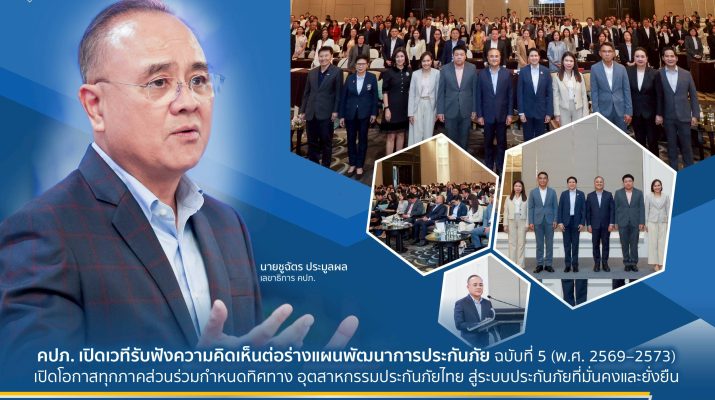 สำนักงานคณะกรรมการกำกับและส่งเสริมการประกอบธุรกิจประกันภัย (สำนักงาน คปภ.) จัดการประชุมรับฟังความคิดเห็น (Public Hearing) ต่อร่างแผนพัฒนาการประกันภัย ฉบับที่ 5 (พ.ศ. 2569–2573) เพื่อเปิดโอกาสให้ทุกภาคส่วนในอุตสาหกรรมประกันภัยได้มีส่วนร่วมในการกำหนดทิศทางอนาคตของอุตสาหกรรมประกันภัยไทยไปด้วยกัน โดยมีนายชูฉัตร ประมูลผล เลขาธิการ คปภ. เป็นประธานเปิดการประชุม เมื่อวันที่ 22 กันยายน 2568 ณ ห้องวิภาวดี บอลรูม โรงแรมเซ็นทารา แกรนด์ เซ็นทรัลพลาซา ลาดพร้าว กรุงเทพฯ