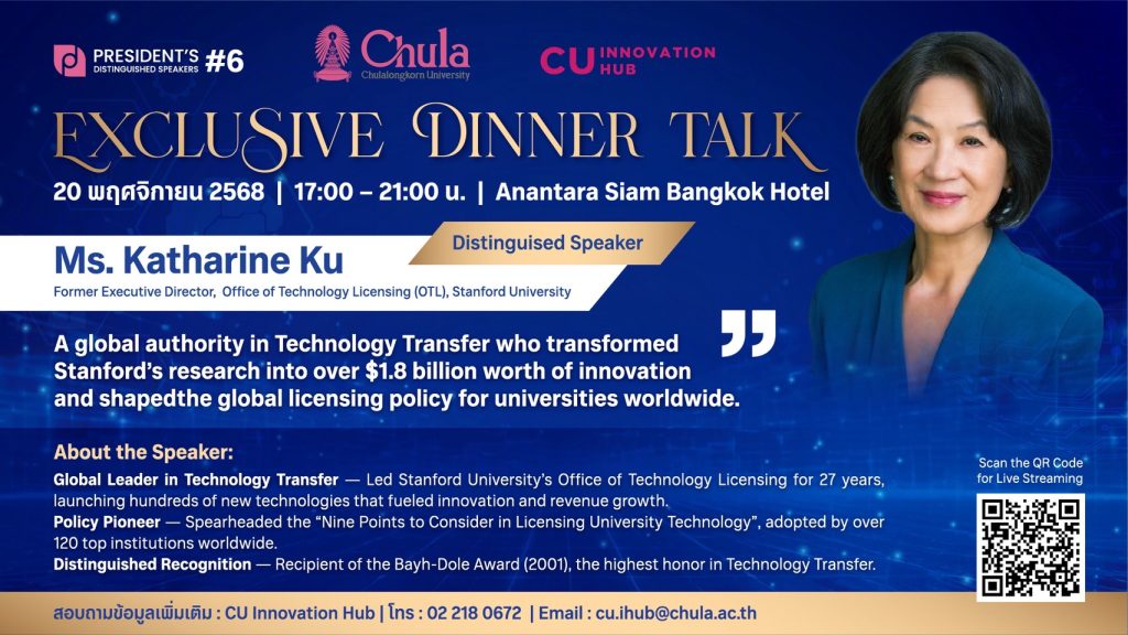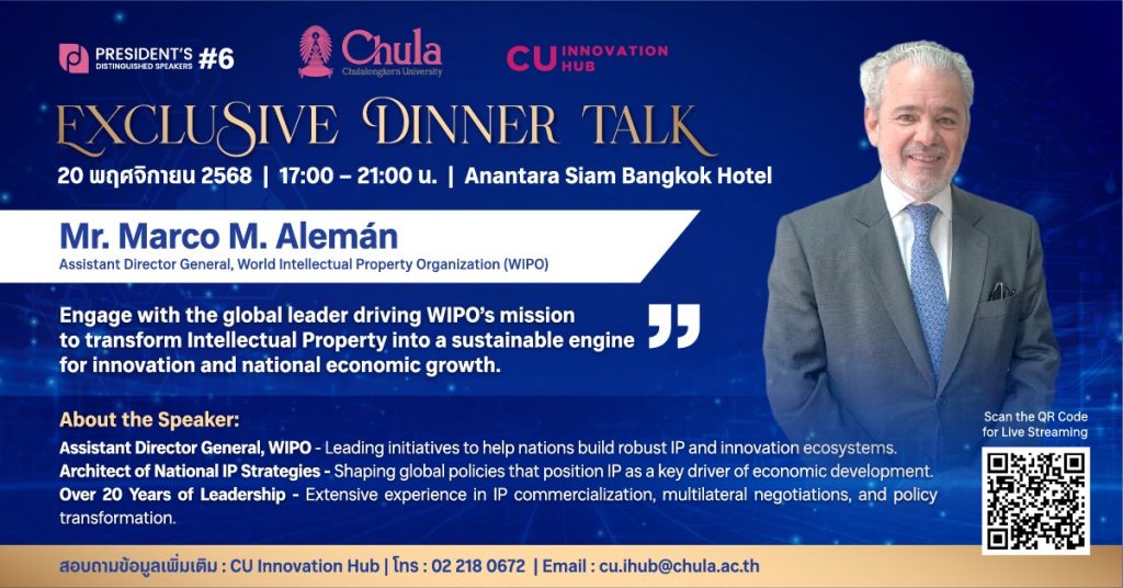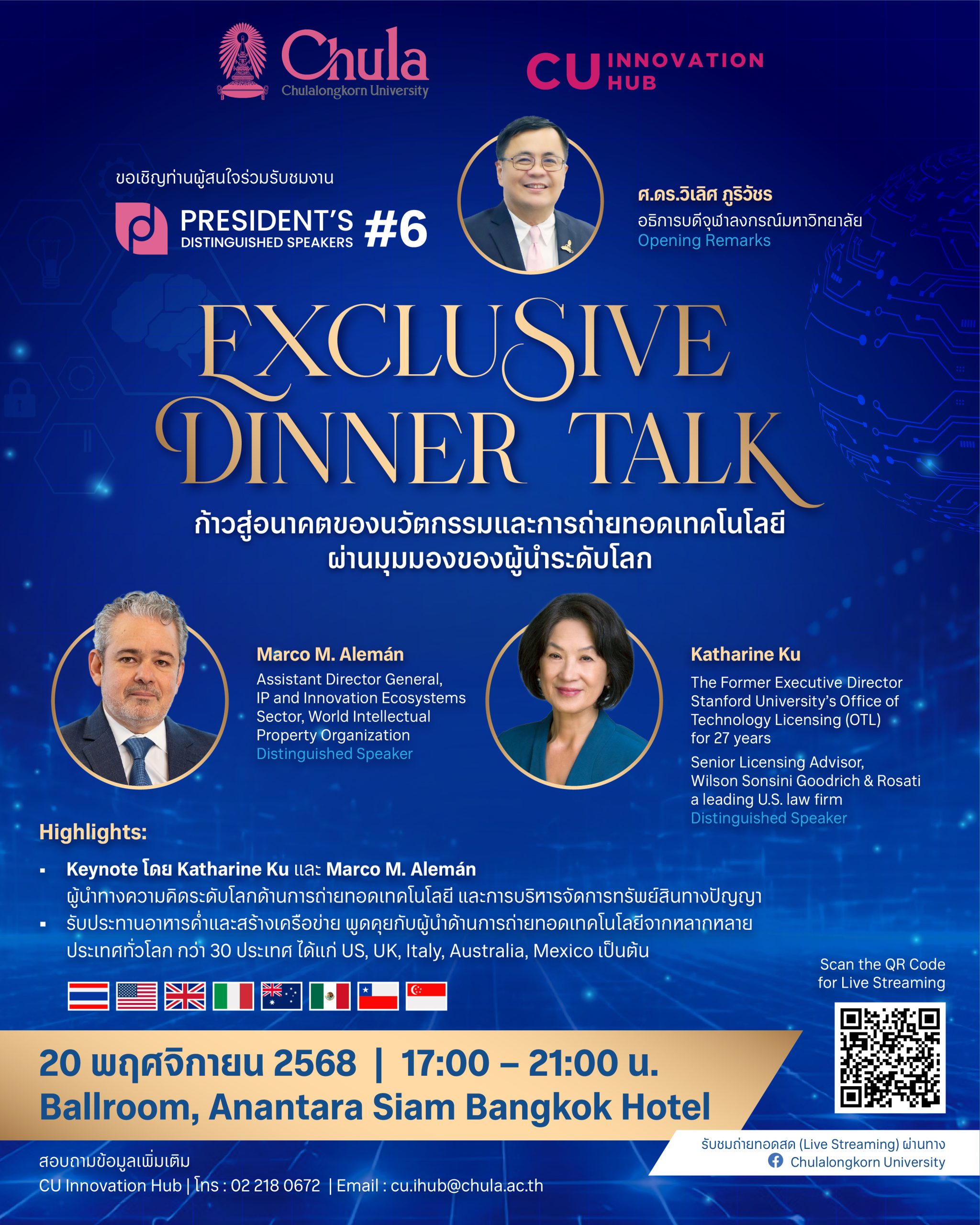 จุฬาลงกรณ์มหาวิทยาลัยขอเชิญชวนบุคคลทั่วไป ผู้สนใจด้านนวัตกรรม และบุคลากรในระบบนิเวศธุรกิจนวัตกรรม เข้าร่วมรับชมการถ่ายทอดสด (Live Streaming) งาน “President’s Distinguished Speaker” ครั้งที่ 6 เพื่อเปิดมุมมองและรับฟังแนวคิดจากสองผู้นำระดับโลกด้านนวัตกรรม และทรัพย์สินทางปัญญาที่จะมาร่วมแบ่งปันประสบการณ์การพัฒนาระบบนิเวศนวัตกรรมและการจัดการทรัพย์สินทางปัญญาในระดับสากล