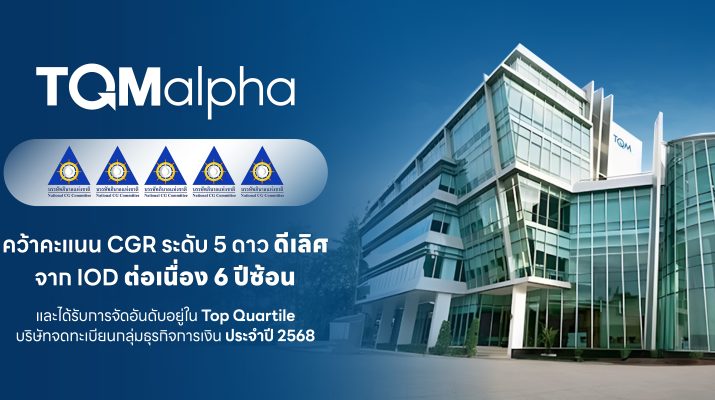 บริษัท ทีคิวเอ็ม อัลฟา จำกัด (มหาชน) หรือ TQMalpha ได้รับคะแนนประเมินการกำกับดูแลกิจการอยู่ในระดับ “ดีเลิศ” (Excellent CG Scoring) ต่อเนื่องเป็นปีที่ 6 จากสมาคมส่งเสริมสถาบันกรรมการบริษัทไทย (IOD) ภายใต้การสนับสนุนของตลาดหลักทรัพย์แห่งประเทศไทย (SET) ซึ่งจัดทำรายงานการประเมินการกำกับดูแลกิจการของบริษัท จดทะเบียนไทย ประจำปี 2568 (Corporate Governance Report of Thai Listed Companies 2025: CGR)