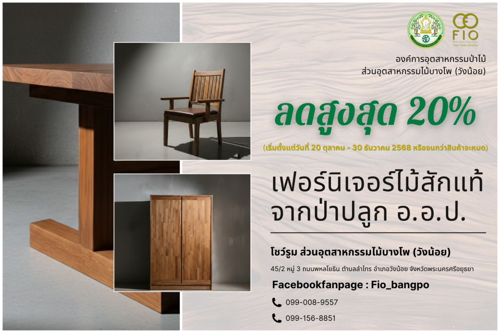 นายชนุดมฯ กล่าวเพิ่มเติมอีกว่า เพื่อเป็นการส่งเสริมให้ประชาชนได้เข้าถึงผลิตภัณฑ์เฟอร์นิเจอร์ไม้สักแท้จากสวนป่าของ อ.อ.ป. อาทิ โต๊ะ ตู้ เตียง เก้าอี้ ชั้นวางของ รวมถึงงานสั่งผลิตและงานแกะสลักต่างๆ อ.อ.ป. โดยส่วนอุตสาหกรรมไม้บางโพ (สาขาวังน้อย) ได้จัดโปรโมชั่นพิเศษส่งท้ายปี 2568 สำหรับเฟอร์นิเจอร์ไม้สักทุกประเภท โดย อ.อ.ป. จะมอบส่วนลดทันที 10% สำหรับการซื้อชิ้นแรก และส่วนลด 15% สำหรับยอดซื้อระหว่าง 50,001–100,000.- บาท, และลดสูงสุด 20% สำหรับยอดซื้อมากกว่า 100,000.- บาท ขึ้นไป โดยโปรโมชั่นดังกล่าวฯ เริ่มตั้งแต่บัดนี้ – 30 ธันวาคม 2568 หรือจนกว่าสินค้าจะหมด