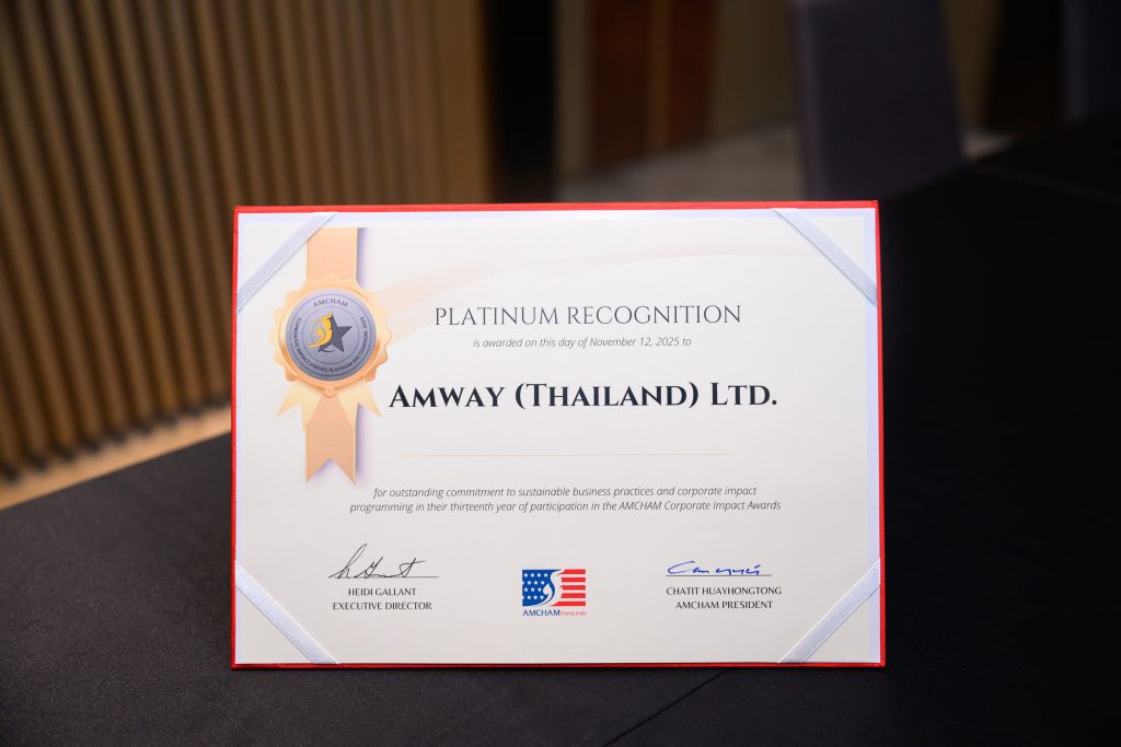 แอมเวย์ประเทศไทย นำโดยตัวแทนคณะกรรมการกิจกรรมเพื่อสังคม เข้ารับรางวัล“องค์กรที่สร้างความเปลี่ยนแปลงเชิงบวกให้กับสังคม” (AMCHAM Corporate Impact Awards) ระดับแพลตินัม จากหอการค้าอเมริกันในประเทศไทย (The American Chamber of Commerce in Thailand: AMCHAM) ต่อเนื่องเป็นปีที่ 13 ตอกย้ำความเป็นผู้นำด้านความรับผิดชอบต่อสังคมและสร้างความเปลี่ยนแปลงเชิงบวกให้กับผู้คน ในสังคมไทย โดยมี คุณแคทเธอรีน สปิลแมน (ที่ 1 จากขวา) อัครราชทูตที่ปรึกษาฝ่ายพาณิชย์ ประจำสถานทูตสหรัฐอเมริกาประจำประเทศไทย มอบรางวัลพร้อมด้วย คุณไซมอน เดนย์ (ที่ 1 จากซ้าย) กรรมการบริหารหอการค้าอเมริกันในประเทศไทย ร่วมแสดงความยินดี ณ โรงแรม นิกโก้ กรุงเทพฯ เมื่อเร็ว ๆ นี้