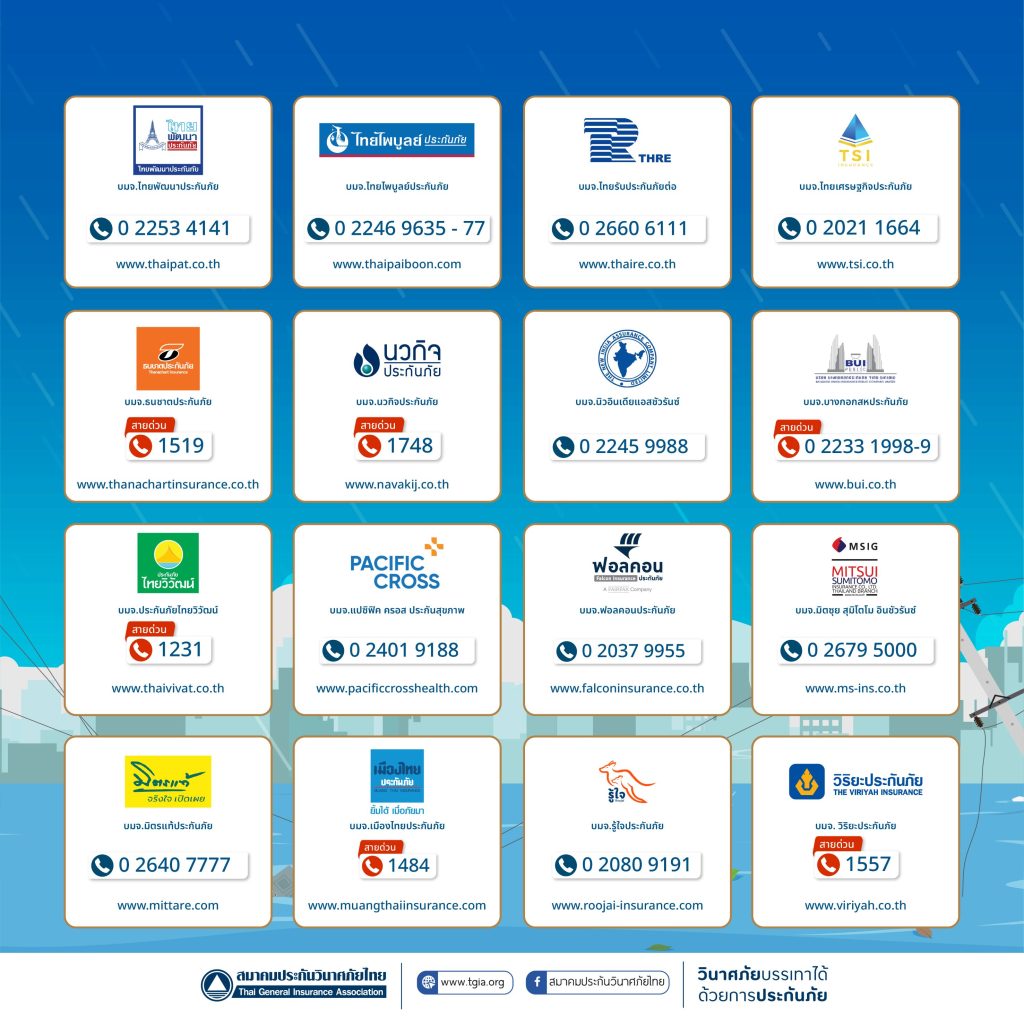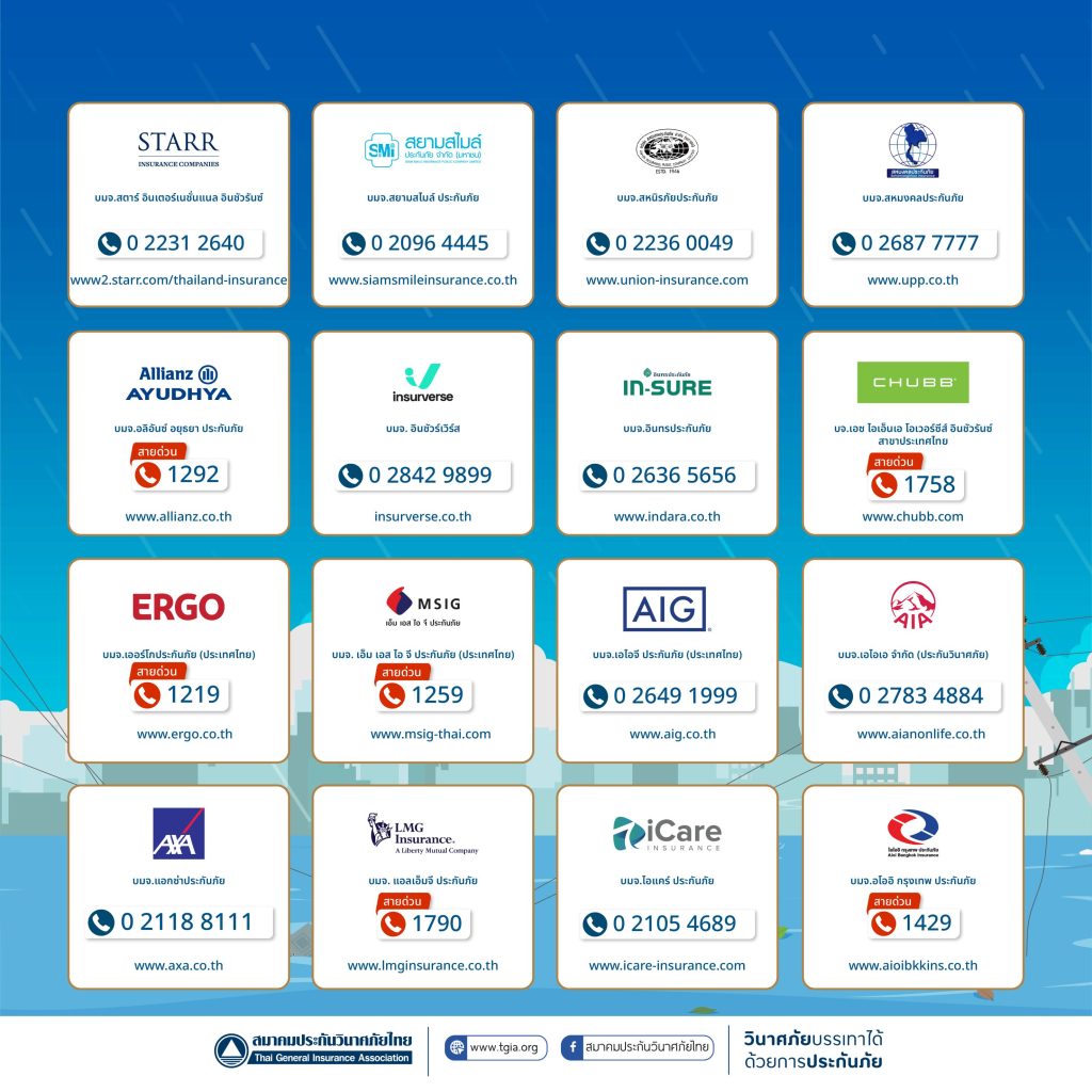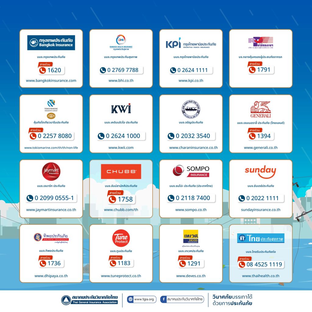 นายกสมาคมประกันวินาศภัยไทย กล่าวเพิ่มเติมว่า เพื่อเป็นการดูแลและให้บริการผู้เอาประกันภัยที่ได้รับความเสียหาย สมาคมประกันวินาศภัยไทย ได้ตั้งศูนย์ประสานงานและอำนวยความสะดวกด้านประกันภัย เพื่อช่วยอำนวยความสะดวกในการเรียกร้องค่าสินไหมทดแทน การตรวจสอบข้อมูลในกรณีที่กรมธรรม์สูญหาย ตลอดจนการให้คำแนะนำเกี่ยวกับรายละเอียดความคุ้มครองผ่านช่องทางโทรศัพท์ 0 2108 8399 ในวันและเวลาทำการ และช่องทางออนไลน์ Facebook สมาคมประกันวินาศภัยไทย ตลอด 24 ชั่วโมง พร้อมทั้งเผยแพร่ประชาสัมพันธ์หมายเลขสายด่วนของทุกบริษัทประกันภัยให้ประชาชนรับทราบและติดต่อได้อย่างสะดวกรวดเร็ว รวมถึงประสานงานกับบริษัทสมาชิกให้เตรียมความพร้อมในการให้บริการช่วยเหลืออย่างเต็มที่ เร่งดำเนินการจ่ายค่าสินไหมทดแทน เพื่อบรรเทาความเดือดร้อนของผู้เอาประกันภัยโดยเร็วที่สุด