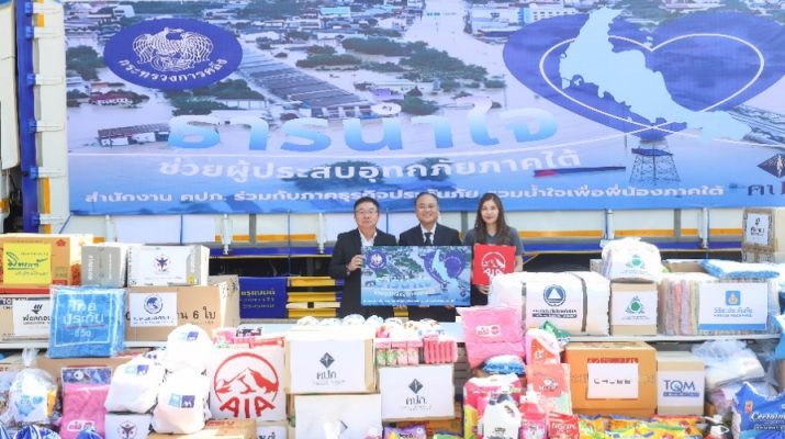 เอไอเอ ประเทศไทย เร่งส่งมอบความช่วยเหลือแก่ผู้ประสบอุทกภัยภาคใต้ ผ่านหน่วยงานทั้งภาครัฐและเอกชน นำโดย นายสุวิรัช พงศ์เสาวภาคย์ (ซ้ายสุด) ผู้อำนวยการฝ่ายกิจการภายนอก เอไอเอ ประเทศไทย เป็นตัวแทนร่วมมอบเครื่องอุปโภคบริโภคและของใช้จำเป็นผ่านโครงการ “ธารน้ำใจช่วยผู้ประสบอุทกภัยภาคใต้” โดยได้รับเกียรติ จากนายชูฉัตร ประมูลผล เลขาธิการคณะกรรมการกำกับและส่งเสริมการประกอบธุรกิจประกันภัย เป็นประธานรับมอบ เพื่อส่งต่อความช่วยเหลือไปยังประชาชนผู้ประสบมหาอุทกภัยในพื้นที่ภาคใต้ ตลอดจนช่วยฟื้นฟูให้กลับมาดำเนินชีวิตได้อย่างเข้มแข็ง ซึ่งกิจกรรมการบริจาคดังกล่าวเป็นส่วนหนึ่งของศูนย์อำนวยการช่วยเหลือเครือข่ายวายุภักษ์ กระทรวงการคลัง โดยมีสำนักงานคณะกรรมการกำกับและส่งเสริมประกอบธุรกิจประกันภัย (คปภ.) เป็นส่วนกลางในการรวบรวมสิ่งของบริจาคเพื่อส่งต่อความช่วยเหลือให้ถึงพี่น้องชาวใต้อย่างเร่งด่วน ณ ลานอเนกประสงค์ สำนักงาน คปภ.