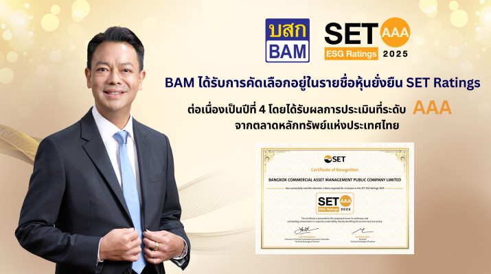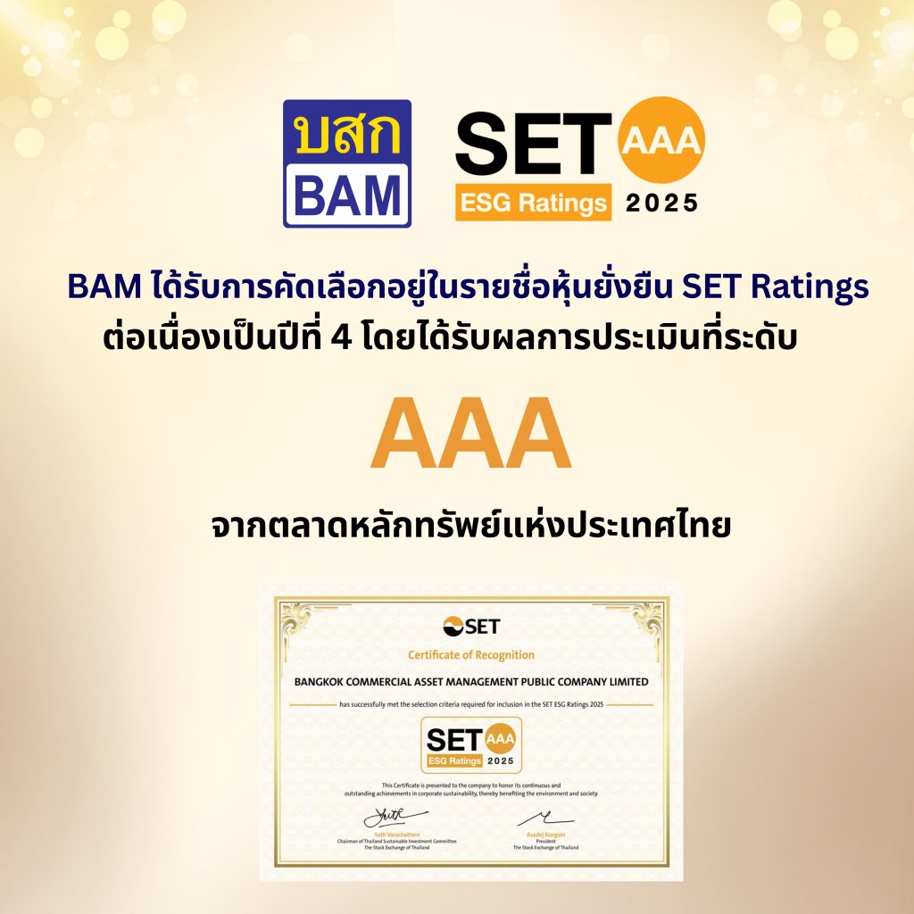 ดร.รักษ์ วรกิจโภคาทร ประธานเจ้าหน้าที่บริหาร BAM เปิดเผยว่า BAM ได้รับผลประเมินหุ้นยั่งยืน SET ESG Ratings ระดับ “AAA” ในกลุ่มธุรกิจการเงิน (Financials) จากการประกาศผลประเมินหุ้นยั่งยืน SET ESG Ratings ประจำปี 2568 ของตลาดหลักทรัพย์แห่งประเทศไทย สะท้อนให้เห็นถึงความมุ่งมั่นในการดำเนินงานของบริษัทฯ ที่ให้ความสำคัญต่อการดำเนินธุรกิจอย่างยั่งยืน ยกระดับ การดำเนินงานภายใต้กรอบ ESG ครอบคลุมในทุกมิติ ทั้งด้านสิ่งแวดล้อม สังคม เศรษฐกิจและ การกำกับดูแลกิจการ โดยคำนึงถึงผู้มีส่วนได้เสียทุกภาคส่วน ตอบสนองวิสัยทัศน์ “เป็นองค์กรหลักในการพลิกฟื้นสินทรัพย์เพื่อช่วยขับเคลื่อนเศรษฐกิจและสังคมไทยให้เติบโตอย่างยั่งยืน” และแสดงให้เห็นถึงศักยภาพการเติบโตขององค์กรในระยะยาว