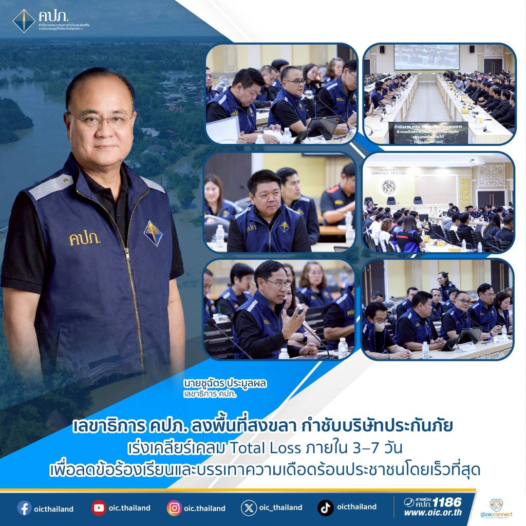 เมื่อวันที่ 12 ธันวาคม 2568 นายชูฉัตร ประมูลผล เลขาธิการคณะกรรมการกำกับและส่งเสริมการประกอบธุรกิจประกันภัย (เลขาธิการ คปภ.) พร้อมด้วยคณะผู้บริหารและพนักงาน สำนักงาน คปภ. ได้ลงพื้นที่จังหวัดสงขลา เพื่อเข้าร่วมการประชุมร่วมกับผู้บริหารระดับสูงของบริษัทประกันภัย เพื่อหารือแนวทางการแก้ไขปัญหาอุทกภัยในพื้นที่ภาคใต้เป็นการเร่งด่วน ณ ศาลากลางจังหวัดสงขลา