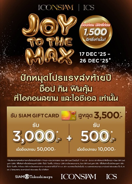ไอคอนสยาม และไอซีเอส ไลฟ์สไตล์ คอมเพล็กซ์ กระตุ้นการจับจ่ายในช่วงเทศกาลส่งท้ายปี ด้วยการมอบของขวัญสุดพิเศษผ่านโปรโมชั่นแคมเปญ “JOY TO THE MAX” ให้ลูกค้าเอนจอยกับความสุขขั้นสุด รับ Siam Gift Card ทุกวัน สูงสุด 3,500 บาทต่อท่าน รวมมูลค่ากว่า 3 ล้านบาท