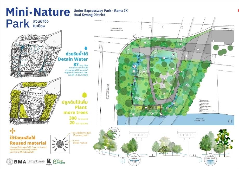 กองทุนรวม คนไทยใจดี (BKIND) โดย BBLAM จึงเข้ามาสนับสนุนให้โครงการ Mini Nature Park สวนป่าจิ๋วในเมือง เกิดขึ้นจริง ทั้งด้านงบประมาณ ความร่วมมือและการเชื่อมพลังพันธมิตรที่เชี่ยวชาญแต่ละด้านเข้าด้วยกัน เพื่อให้สวนป่าจิ๋วแห่งนี้เป็นตัวอย่างของการขับเคลื่อนเมืองอย่างยั่งยืน ทีมงานเริ่มจากการสำรวจระดับดิน ออกแบบร่องรับน้ำ ปรับการจัดการน้ำฝน และปลูกพรรณไม้พื้นถิ่นกว่า 280 ต้น ที่เหมาะกับสภาพใต้ทางด่วน โดยนำวัสดุเดิมในพื้นที่กลับมาใช้ใหม่อย่างคุ้มค่า เพราะเป้าหมายไม่ใช่เพียง “ปลูกต้นไม้เพิ่ม” แต่คือ การสร้างระบบนิเวศที่เติบโตได้จริง ในบริบทของเมือง
