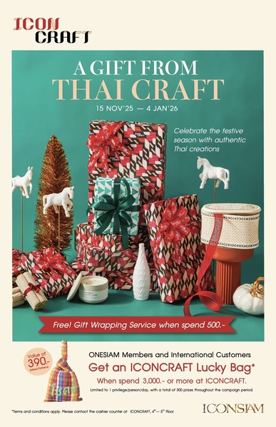 เทศกาลแห่งความสุขและการให้ปีนี้ ร่วมส่งมอบของขวัญงานคราฟต์ที่เปี่ยมด้วยคุณค่า ในแคมเปญ “A Gift from Thai Craft, Season of Thai Artisan Celebrations” พร้อมโปรโมชันพิเศษตลอดเทศกาล เมื่อ มียอดใช้จ่าย 500 บาทขึ้นไป/ใบเสร็จ รับบริการห่อของขวัญฟรี! สำหรับสมาชิก ONESIAM ช็อปครบ 3,000 บาทขึ้นไป/ใบเสร็จ รับฟรี! ICONCRAFT LUCKY BAG มูลค่า 390 บาท ตั้งแต่วันนี้ – 4 ม.ค. 69 ณ ไอคอนคราฟต์ ชั้น 4-5 ไอคอนสยาม และ ICONCRAFT & Friends Pop-up Store, ชั้น 3 North Zone, Siam Paragon