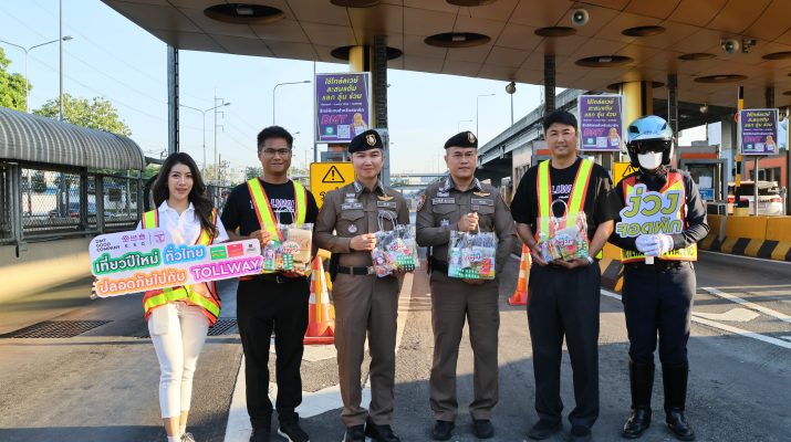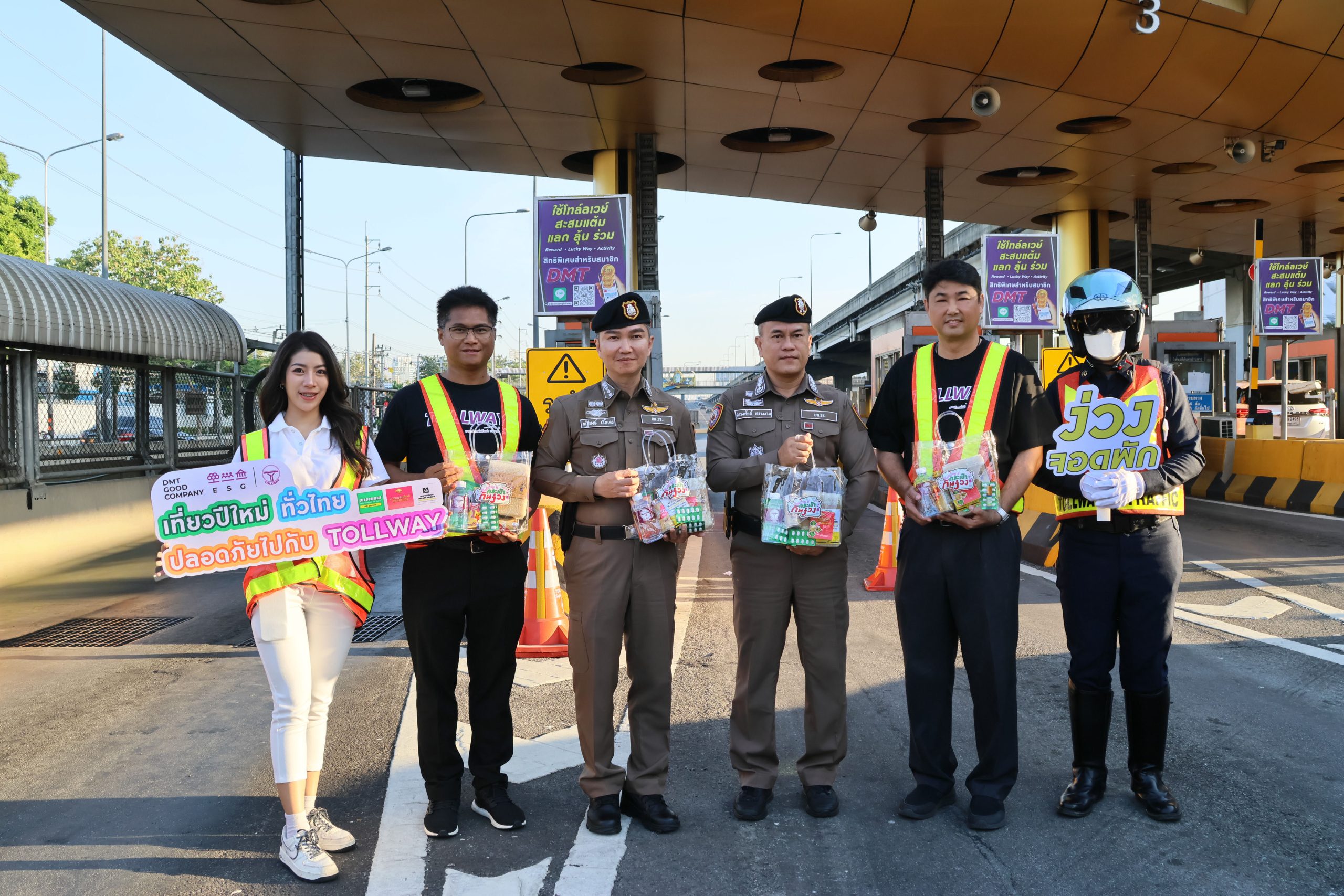 วันนี้ บมจ.ทางยกระดับดอนเมือง หรือ DMT นำโดย ดร.สัณห์ พันธ์อุไร (คนที่2จากขวา) ผู้ช่วยรองกรรมการผู้จัดการสายงานปฏิบัติการและ นาย นพพล โพธิ์ขี (คนที่2จากซ้าย) ผอ.ฝ่ายพัฒนาธุรกิจและกลยุทธ์เพื่อความยั่งยืน พร้อมด้วย พล.ต.ต.ดำรงศักดิ์ สว่างงาม (คนที่3จากขวา) ผบก.จร. และ พ.ต.อ.ณัฐพงษ์ เชื้อเดช (คนที่3จากซ้าย) รอง ผบก.จร. ให้เกียรติร่วมมอบกระเป๋ากันง่วง “เที่ยวปีใหม่ทั่วไทย ปลอดภัยไปกับโทล์ลเวย์” กับทีม DMT เพื่อแทนความห่วงใยและร่วมรณรงค์ขับขี่อย่างมีวินัย เพื่อความปลอดภัยในการใช้รถใช้ถนนอย่างยั่งยืน ณ ด่านดินแดง 1 ทางยกระดับอุตราภิมุข