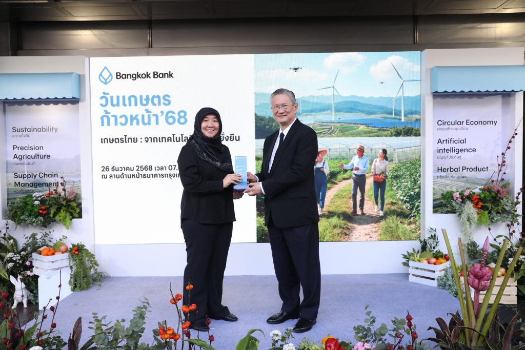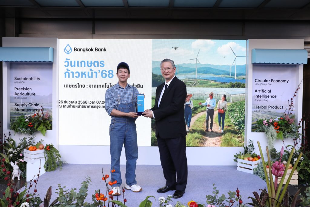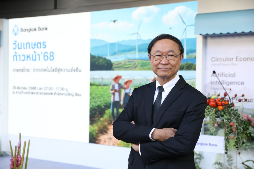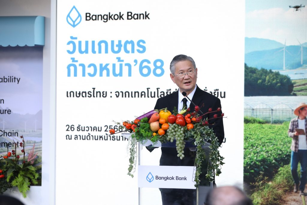 นายพิเชฐ ดุรงคเวโรจน์ กรรมการบริหาร ธนาคารกรุงเทพ จำกัด (มหาชน) กล่าวว่า ธนาคารกรุงเทพ มุ่งมั่นสนับสนุน และผลักดันภาคการเกษตรไทยอย่างต่อเนื่องตลอดระยะเวลากว่า 81 ปี ซึ่งงานมหกรรมจำหน่ายสินค้า วันเกษตรก้าวหน้า’ 68 นี้ จัดขึ้นน็นคร้ง้เพื่อยืนยันเจตนารมณ์ของธนาคารที่จะเป็น “เพื่อนคู่คิด มิตรคู่บ้าน” สนับสนุนและอยู่เคียงข้างให้เกษตรกรไทยสามารถพัฒนาอย่างยั่งยืน พร้อมทั้งเปิดโอกาสให้ภาคเกษตรไทยได้ก้าวสู่เวทีโลกอย่างมั่นคง ด้วยองค์ความรู้ที่ทันสมัย โดยให้ความสำคัญกับประเด็น การเพิ่มผลผลิตและลดความเสี่ยงด้วยเกษตรแม่นยำ (Precision Agriculture) ซึ่งสามารถช่วยลดต้นทุนปุ๋ยและยาได้ 15–40% และเพิ่มผลผลิตได้ถึง 10–30% การพัฒนาคุณภาพผลผลิตให้ได้มาตรฐานสากล เช่น มาตรฐาน GAP Organic Carbon footprint การแปรรูปนวัตกรรม (Agro-processing Innovation) เช่น ถนอมอาหารด้วยนวัตกรรม Food Tech การใช้เครื่องจักรต้นทุนต่ำในระดับชุมชน การส่งเสริมตลาดและราคาด้วยแพลตฟอร์มดิจิทัล เช่น การใช้ AI วิเคราะห์ราคา-ความต้องการ การตรวจสอบย้อนกลับกระบวนการผลิตและการจัดจำหน่าย (Traceability) ผ่าน Blockchain และการใช้นวัตกรรมเทคโนโลยีชีวภาพ (Biotech) เพื่อเพิ่มผลผลิตอย่างมีประสิทธิภาพ เช่น พันธุ์พืชทนแล้ง ทนโรค และสามารถนำวัสดุเหลือทิ้งทางเกษตรกลับมาใช้ประโยชน์เพื่อลดขยะ ซึ่งเป็นนโยบายและแนวทางที่ประชาคมโลกให้ความสำคัญ ลดการปล่อยก๊าซเรือนกระจกในภาคการเกษตร จนไปสู่ Zero waste ในที่สุด