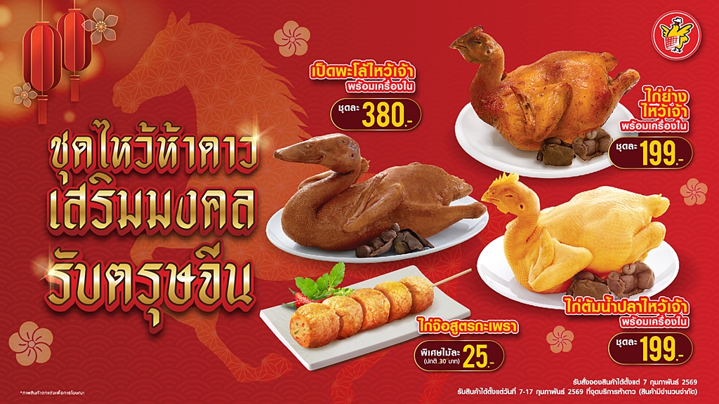 ขณะเดียวกัน CPF ยังรวมแบรนด์อาหารในเครือที่หลายคนคุ้นเคย มาเป็นทางเลือกในการเตรียมของไหว้ให้เหมาะกับไลฟ์สไตล์ ไม่ว่าจะเป็น ห้าดาว ที่มีเมนูไหว้เจ้าพร้อมเครื่องในแบบใกล้บ้าน เป็ดเจ้าสัว ที่จัดของไหว้ครบถ้วนตามธรรมเนียมโดยไม่ต้องลงครัว และ เชสเตอร์ กับชุดไก่ไหว้เจ้ายกกล่องที่ตอบโจทย์คนรุ่นใหม่ พร้อมไหว้ได้ทันที โดยทุกแบรนด์เปิดให้สั่งจองล่วงหน้าและรับสินค้าในช่วงวันที่ 7–17 กุมภาพันธ์ 2569 (สินค้ามีจำนวนจำกัด ตามเงื่อนไขของแต่ละสาขา)
