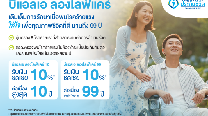 กรุงเทพประกันชีวิต ออกแบบประกันใหม่รับกระแส Longevity กระตุ้นสังคมใส่ใจการมีอายุยืนอย่างมีคุณภาพ ด้วยประกันโรคร้ายแรง บีแอลเอ ลองไลฟ์แคร์ ให้ความคุ้มครอง 8 โรคร้ายแรงที่ส่งผลกระทบต่อการดำเนินชีวิตระยะยาว ให้ความคุ้มครองสูงสุดถึงอายุ 99 ปี เมื่อตรวจพบโรคร้ายแรง ไม่ต้องชำระเบี้ยประกันภัยต่อ พร้อมรับผลประโยชน์เงินชดเชยรายปี 10% ของจำนวนเงินเอาประกันภัย