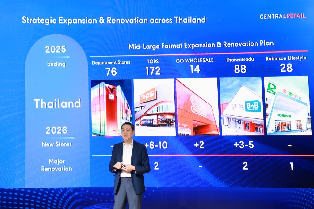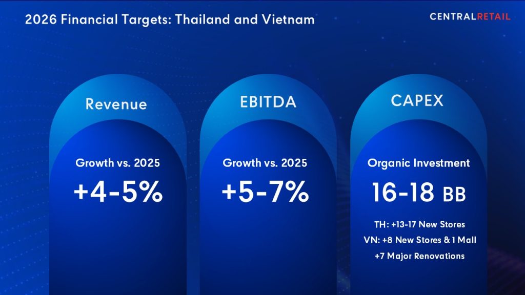 ทั้งนี้เพื่อสร้างการเติบโตอย่างแข็งแกร่งในปี 2569 เซ็นทรัล รีเทล ประกาศทุ่มงบลงทุน 16,000–18,000 ล้านบาท สำหรับการรีโนเวทและการขยายสาขาทั้งในประเทศไทยและเวียดนาม ซึ่งเป็นตลาดยุทธศาสตร์สำคัญ โดยวางแผนขยายสาขาใหม่ของท็อปส์ 8-10 สาขา, GO Wholesale 2 สาขา และไทวัสดุ 3-5 สาขา ส่วนในประเทศเวียดนาม มีแผนขยายสาขาศูนย์การค้า GO! 2 สาขา, ไฮเปอร์มาร์เก็ต GO! 1 สาขา และซูเปอร์มาร์เก็ต Mini go! 6 สาขา พร้อมทั้งมองหาโอกาสในการขยายธุรกิจในตลาดอาเซียนอื่น ๆ อย่างรอบคอบ โดยตั้งเป้าการเติบโตของรายได้ปี 2569 อยู่ที่ 4-5% และ EBITDA ที่ 5-7% เมื่อเทียบกับปีก่อนหน้า ทั้งนี้ เซ็นทรัล รีเทล ให้ความสำคัญกับการบริหารการเงินอย่างมีวินัยเพื่อสร้างยอดขายและกำไรที่มีคุณภาพ รักษาความแข็งแกร่งทางการเงินเพื่อรองรับโอกาสในการควบรวมและเข้าซื้อกิจการ (M&A) ในอนาคต พร้อมทั้งสร้างผลตอบแทนที่ยั่งยืนแก่ผู้ถือหุ้นอย่างต่อเนื่อง