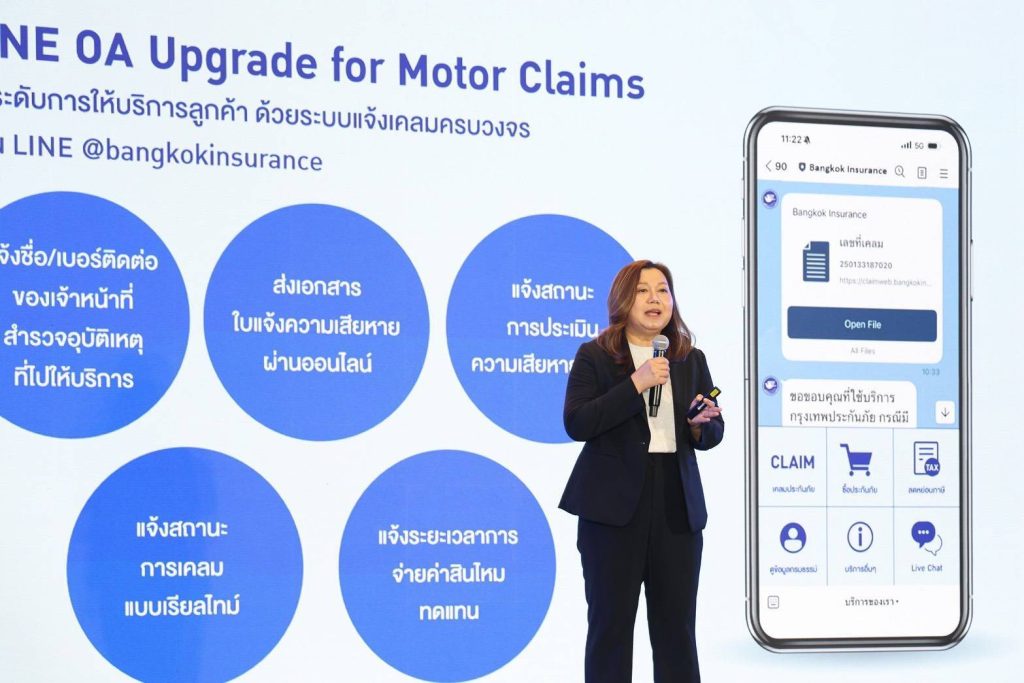 - LINE OA Upgrade for Motor Claims ยกระดับการให้บริการลูกค้าด้วยระบบแจ้งเคลมรถยนต์แบบครบวงจรผ่าน LINE @bangkokinsurance เพื่อเพิ่มความสะดวก รวดเร็ว และเสริมความอุ่นใจให้แก่ลูกค้า โดยสามารถรับทราบข้อมูลสำคัญต่างๆ จากการเคลมประกันภัยรถยนต์ได้อย่างต่อเนื่อง เช่น การแจ้งชื่อและเบอร์โทรศัพท์ของเจ้าหน้าที่สำรวจอุบัติเหตุที่จะเดินทางเข้าไปดูแล การส่งเอกสารใบแจ้งความเสียหายผ่านช่องทางออนไลน์ การแจ้งสถานะการประเมินความเสียหายของรถยนต์ ตลอดจนการติดตามสถานะการเคลมแบบเรียลไทม์ พร้อมทั้งแจ้งระยะเวลาการซ่อมและการจ่ายค่าสินไหมทดแทน นอกจากนี้ บริษัทฯ อยู่ระหว่างการพัฒนา LINE OA for Partners เพื่อช่วยอำนวยความสะดวกและสนับสนุนการทำงานของตัวแทนและนายหน้า ให้มีความคล่องตัวและบริหารจัดการได้ดียิ่งขึ้น ซึ่งจะนำไปสู่การดูแลลูกค้าได้อย่างรวดเร็วและเต็มประสิทธิภาพ