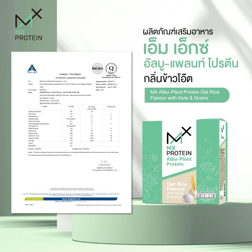 2. ผลิตภัณฑ์เสริมอาหาร เอ็ม เอ็กซ์ อัลบู-แพลนท์ โปรตีน กลิ่นข้าวโอ๊ต (MX Albu-Plant Protein Oat Rice Flavour with Nuts & Grains) สูตรผสานพลังโปรตีนไข่ขาวและพืช (Albu-Plant Formula) ออกแบบมาเพื่อผู้ที่ต้องการฟื้นฟูพลังกล้ามเนื้อขั้นสุด โดยเฉพาะผู้สูงวัยหรือผู้พักฟื้น ด้วยการดึงจุดเด่นของ ‘โปรตีนไข่ขาว’ (Egg Albumin) ซึ่งเป็นโปรตีนคุณภาพสูง มาผสานกับโปรตีนจากถั่วลันเตาและถั่วคุณภาพสูง เพื่อให้ได้กรดอะมิโนครบถ้วนและดูดซึมไว พร้อมเพิ่มคุณค่าด้วย ข้าวโอ๊ต และ ไซเลียมฮัสก์ (Psyllium Husk) ที่มีไฟเบอร์สูง ช่วยดูแลระดับคอเลสเตอรอลและน้ำตาลในเลือด ย่อยง่าย เสริมสร้างกล้ามเนื้อโดยไม่เพิ่มไขมันส่วนเกิน