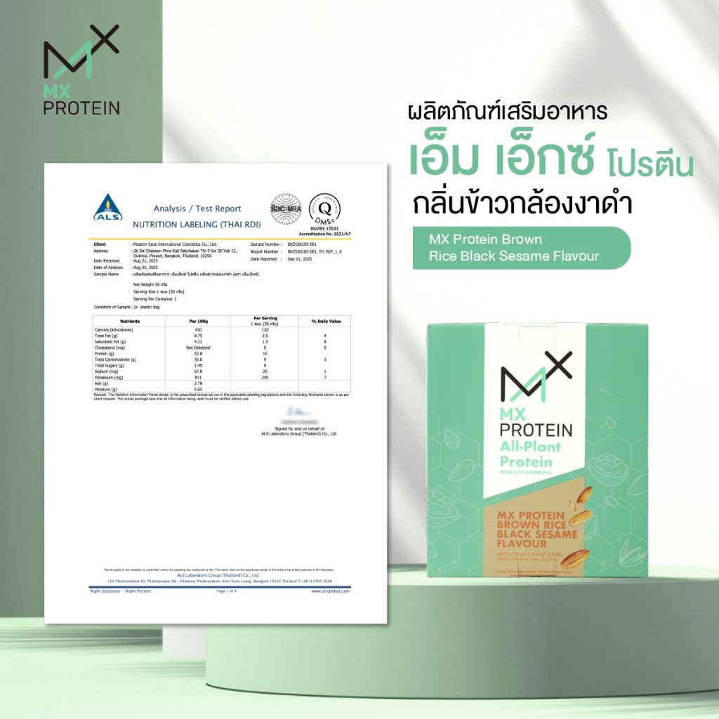 1. ผลิตภัณฑ์เสริมอาหาร เอ็มเอ็กซ์ โปรตีน กลิ่นข้าวกล้องงาดำ (MX Protein Brown Rice Black Sesame Flavour) สูตร All-Plant Protein แบบ Non-Soy (ปราศจากถั่วเหลือง) พัฒนามาเพื่อผู้ที่แพ้ถั่วเหลืองหรือมีปัญหาท้องอืด โดดเด่นด้วยนวัตกรรม “Balanced-Release Protein” (ดูดซึมเร็วแต่คงอยู่ได้นาน) ที่ผสาน ‘โปรตีนจากถั่วลันเตา’ (Pea Protein Isolate) ที่ดูดซึมไว เข้ากับ ‘โปรตีนจากข้าวกล้องงอก 5 สายพันธุ์’ ที่ค่อยๆ ปลดปล่อยกรดอะมิโนอย่างต่อเนื่องยาวนาน ให้โปรตีนสูง อุดมด้วย BCAA และสารต้านอนุมูลอิสระจากงาดำ ปราศจากน้ำตาลทราย (0%) และมีโซเดียมต่ำมากเพียง 20 มิลลิกรัมต่อซอง (คิดเป็น 1% ของความต้องการต่อวัน) จึงเป็นมิตรต่อไตและผู้ที่มีปัญหาความดัน